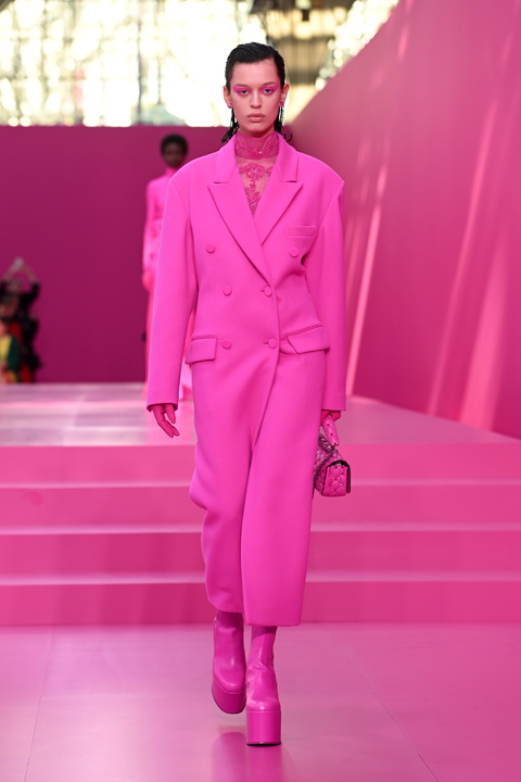Pierpaolo Piccioli, Valentino sonbahar hazır giyimi için aşırı bir renk stratejisi benimsedi. Pistindeki her bakış pembeydi; set dâhil her şey fuşyanın canlı bir tonundaydı. Arada siyah bir mola verildi.