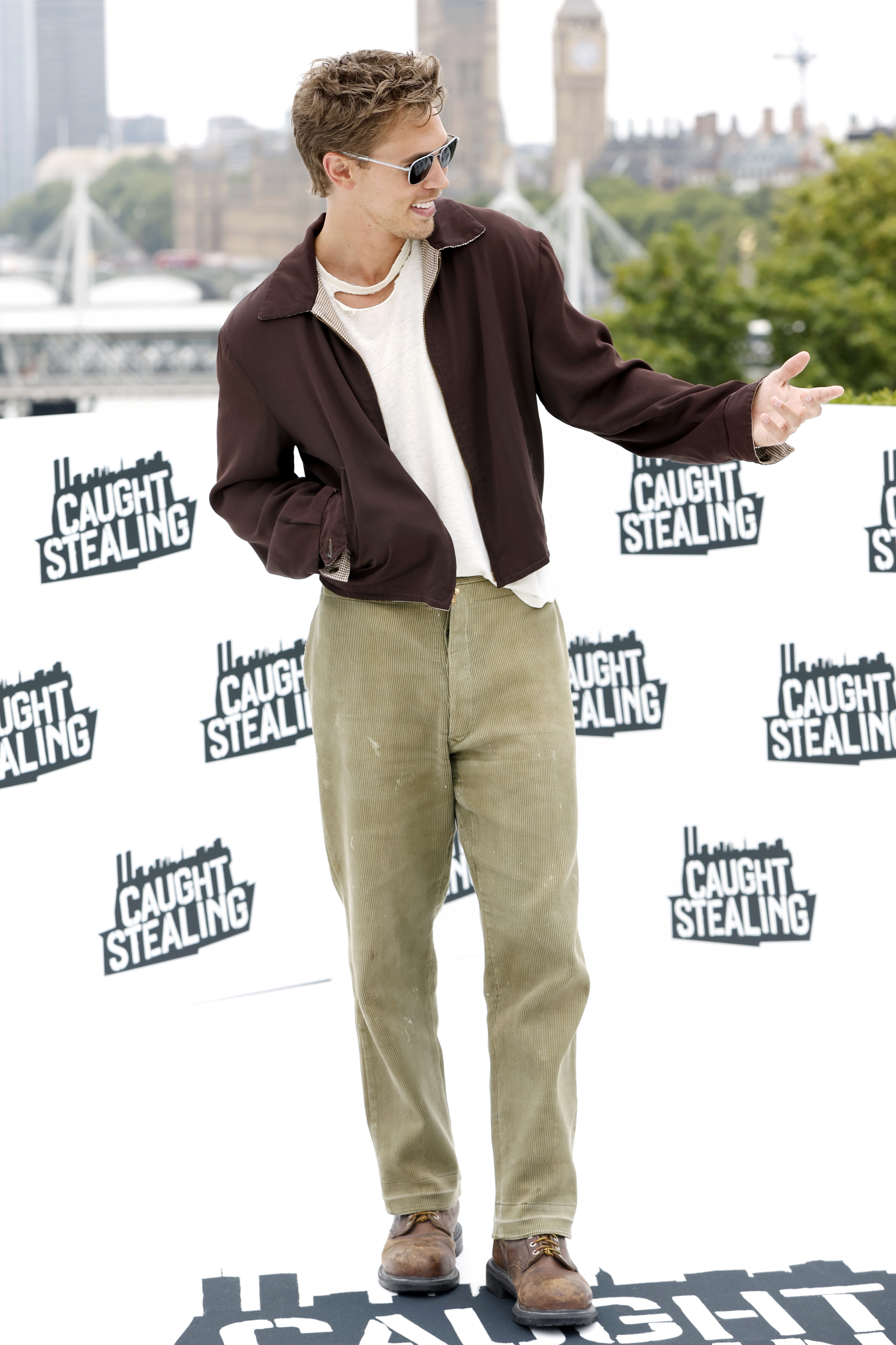 Austin Butler, Caught Stealing filminin basın turunda klasik Hollywood şıklığından uzak, daha sade ama dikkat çekici bir tarzla karşımıza çıkıyor.
