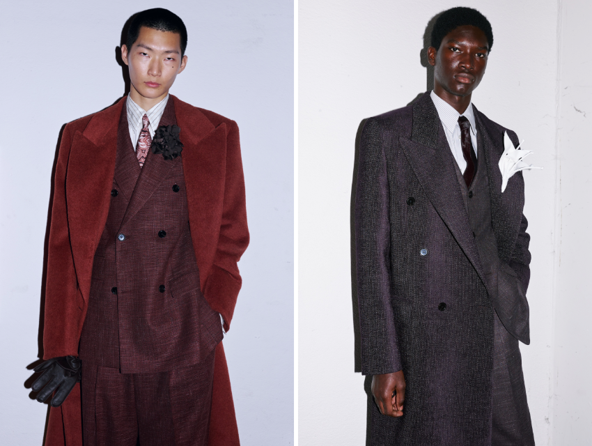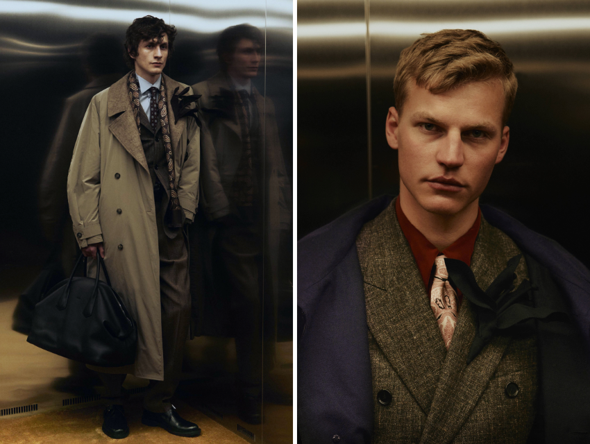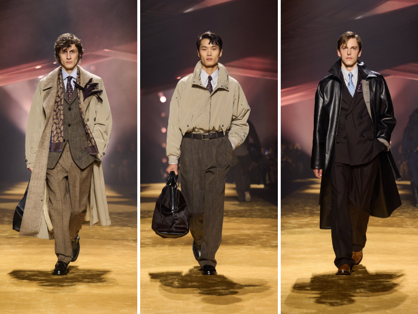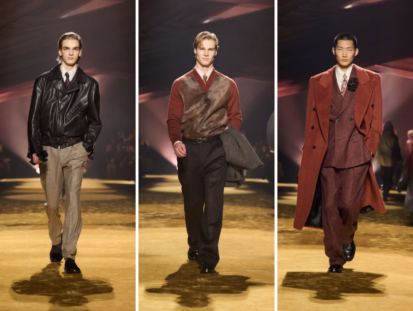 Arşivle çalışan biri olarak bu koleksiyonda ilgimi çeken şey, stil kodlarının romantik bir nostaljiye sığınmadan bugüne taşınmasıydı. Terra tonları, mürdüm siyahlar ve derin bordolar; mat yün dokularla parlak deri yüzeylerin yan yana gelişi, geçmişin maskülenliğinin daha içsel ve olgun bir noktaya evrilmesini sağlıyor.