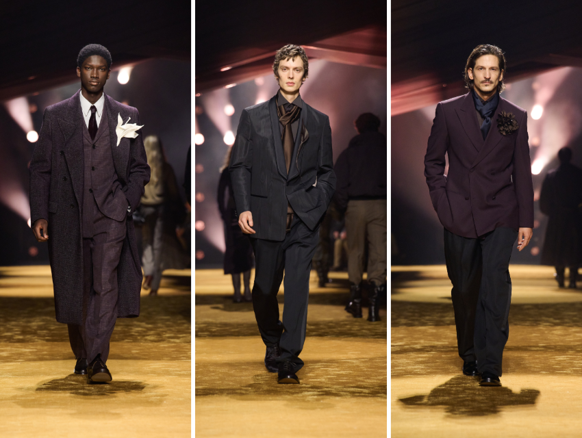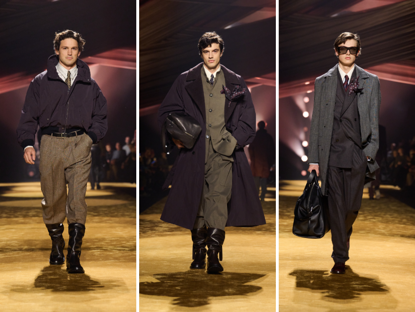 Şarkının sözlerinde geçen o “poz vermemeye çalışan” figür, aslında bakışın ağırlığını bilen bir erkekti; ışığın altında durmayı kabul eden ama ona teslim olmayan. Podyumdaki silüet de tam olarak böyleydi: gösterişli ama abartısız, dikkat çekici ama kendini ispat etme telaşı taşımayan. Omuzları genişti belki, palto ağırdı, paisley kravat bir hafıza gibi göğsünde duruyordu ama bütün bu ihtişamın içinde bir mesafe vardı. Sanki o erkek, kameraların farkında ama onlara ait değilmiş gibi yürüyordu. Glamour burada bir poz değil, içten gelen bir disiplin, bir bakışın içinde saklanan, kendini açıklamak zorunda hissetmeyen bir özgüvendi.