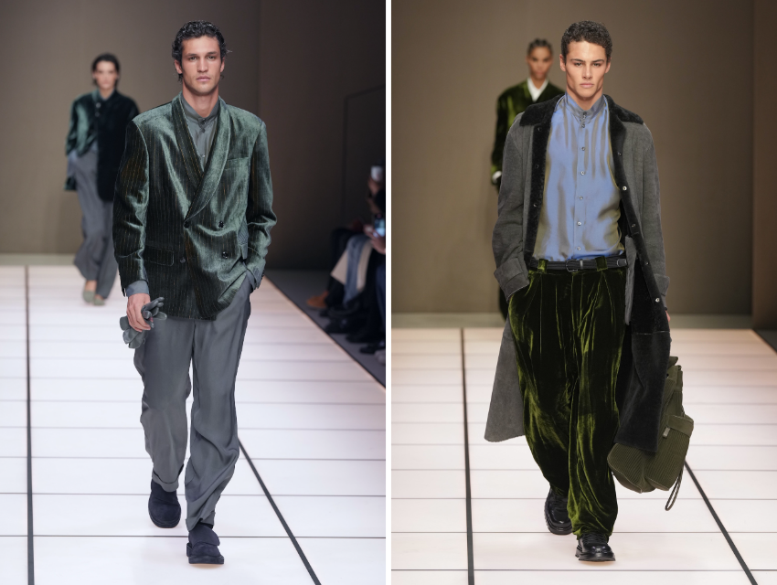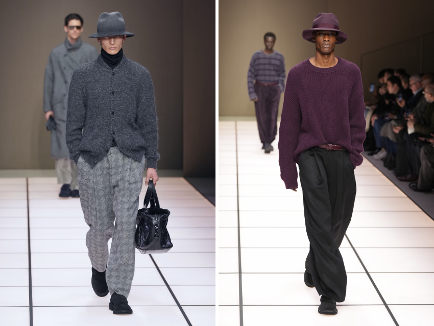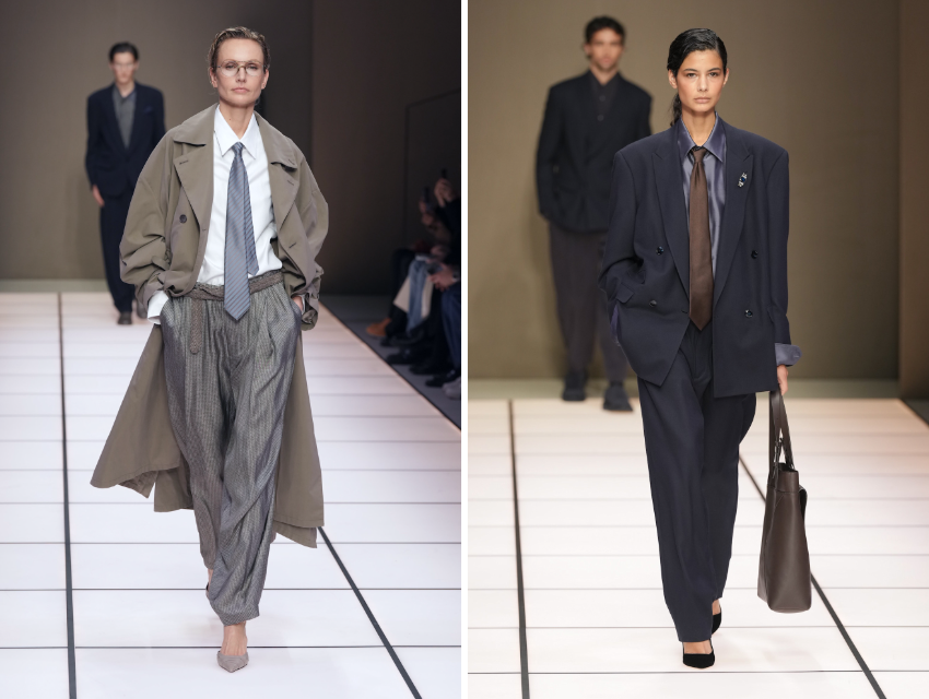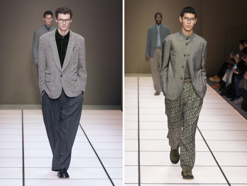 Defile, Armani’nin imzası haline gelmiş yumuşak terzilikle açılıyor. Bej, kömür grisi ve sıcak nötr tonlardaki ceketler gevşek omuzları ve akışkan yapılarıyla bedeni sarmak yerine onunla birlikte hareket ediyor. Siluetler hâlâ rahat ancak önceki sezonlara kıyasla biraz daha toplu ve bedene yakın.
