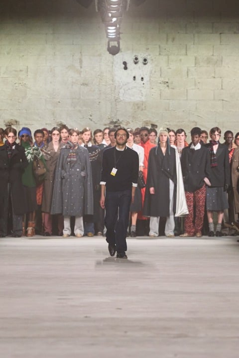 Koleksiyonun genel havasında belirgin bir gençlik ve kampüs ruhu hissediliyordu. Cep armaları, mezuniyet pelerinlerini andıran formlar, klasik erkek giyim kumaşlarından yapılmış büyük okul çantaları bu anlatıyı destekledi. Trapper şapkalar, ortadan ayrılmış saçlar ve okuma gözlükleri stilin bilinçli bir şekilde “akıllı ama rahat” bir çizgide tutulduğunu gösterdi.