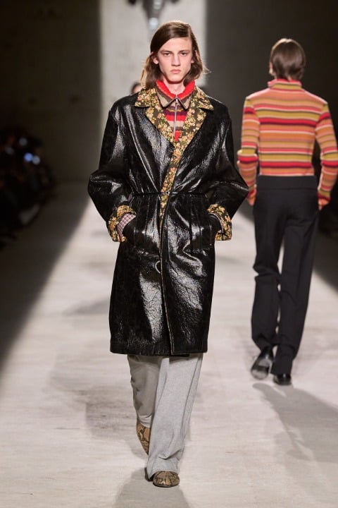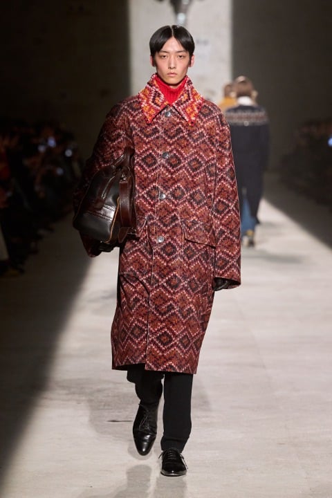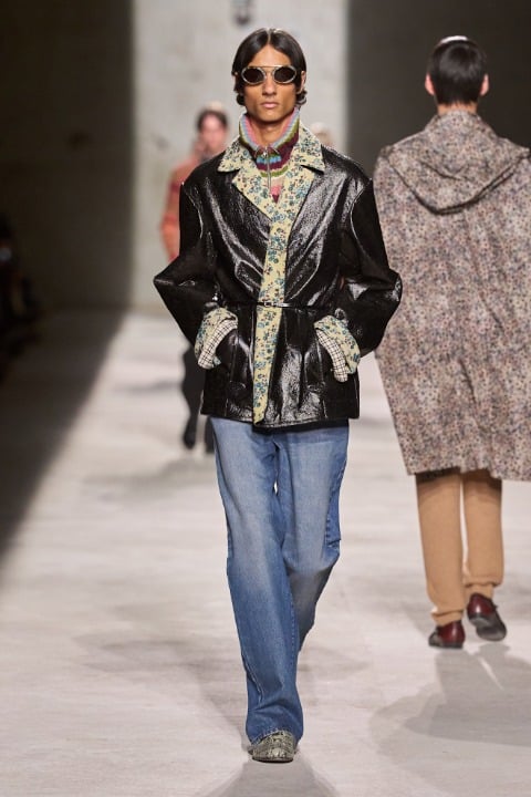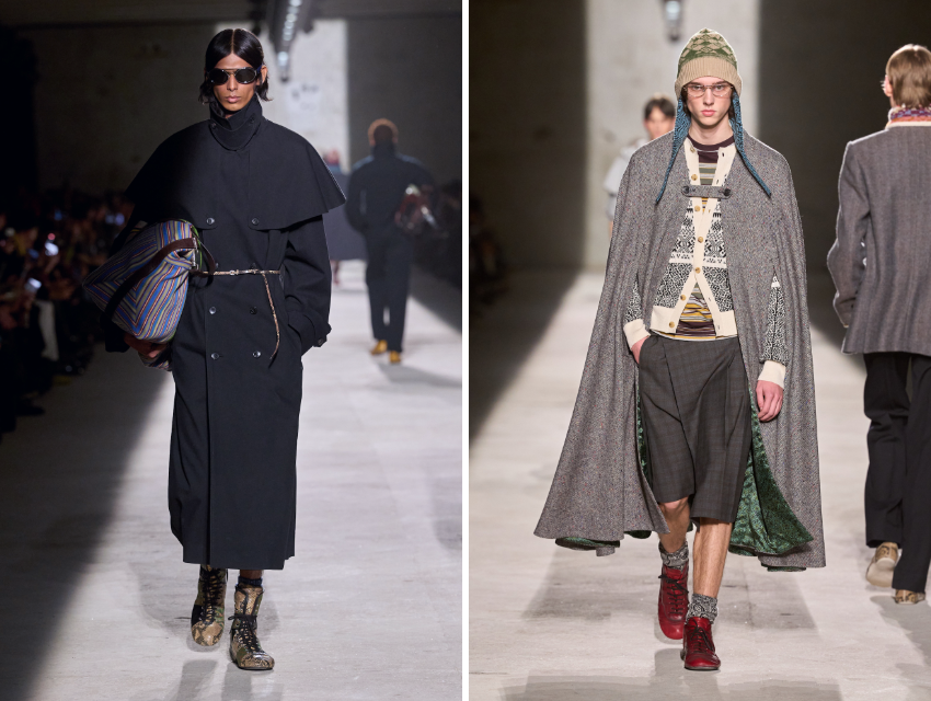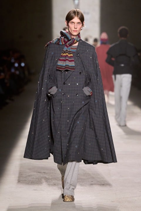 Dries Van Noten’in kreatif direktörü olarak ikinci erkek koleksiyonunu sunan Julian Klausner, desenlere duyduğu coşkuyu bu sezon da saklamıyor. Botaniklerden çiçeklere, Fair Isle örgülerden klasik şal desenlerine, ekoselerden geometrik formlara uzanan geniş bir görsel repertuvar Sonbahar/Kış koleksiyonunun temelini oluşturuyor. Zaman zaman bu yoğunluk, incelikli terziliği gölgede bırakacak kadar güçlü; ancak Klausner’in kontrolü elden bırakmadığı da açık.