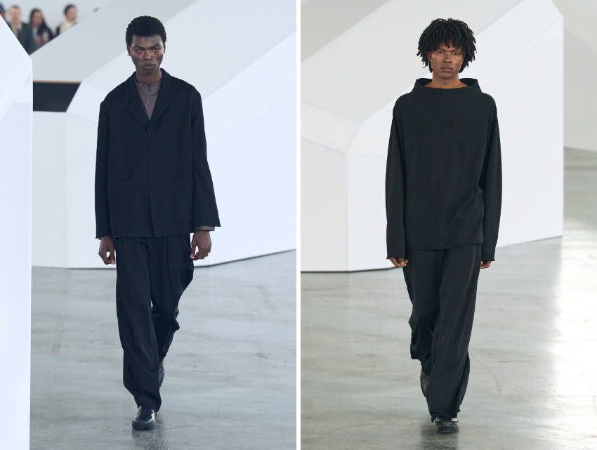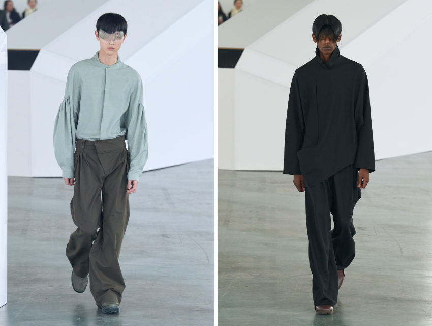 Açılışı yapan uzun tunikler ve akışkan pantolonlar, sade ama neredeyse manastır hissi veren bir siluet dili kuruyor. Ancak yakından bakıldığında bu yalınlık, detaylı bir yapı bilgisiyle zenginleşiyor. Katlanmış parçalar, gizli büzgüler ve ince nervürler, yüzeyde değil formun içinde çalışıyor. Spor parçalarda bile, anoraklar, bağcıklı pantolonlar gibi, bu yapı dili korunuyor. Yakasız ceketler ağır jarse kumaşla yumuşak ama hacimli bir form kazanıyor.