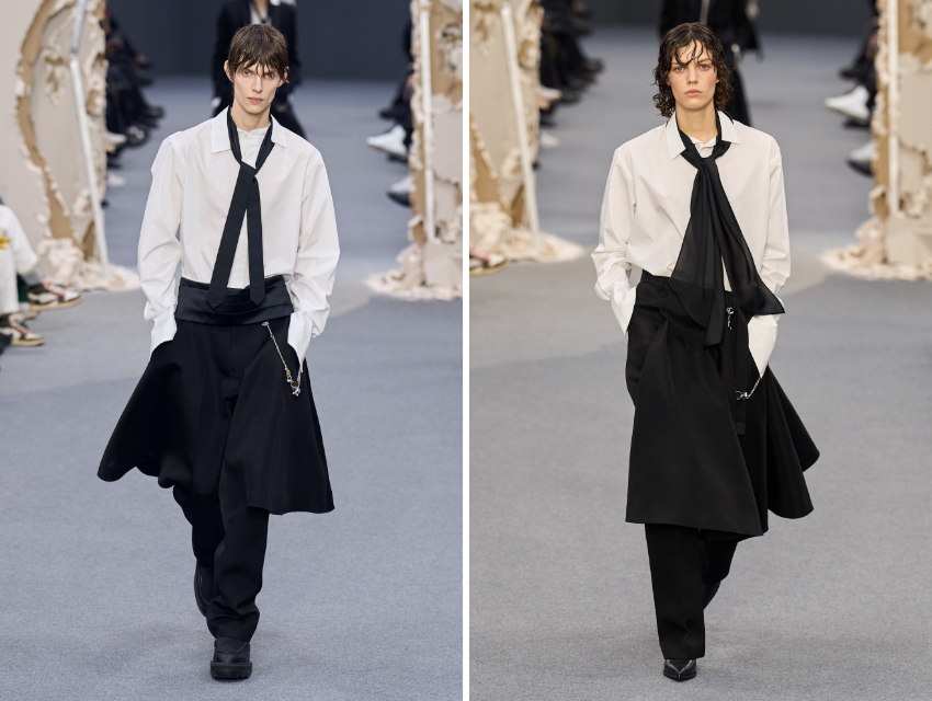 Özgürlük fikri, koleksiyonun yapısında da kendini gösteriyor. Abe, bu sezon erkek koleksiyonunu ve pre-fall 2026 kadın parçalarını birbirine daha da yaklaştırarak beklenmedik, androjen görünümler yaratıyor. Defile siyah-beyaz bir açılışla başlıyor: Formal gömlekler, gevşek bırakılmış kravatlar ve tek parça kumaştan üretilmiş pantolon–etek hibritleri görüyoruz. Bu hibritler, katmanlı fakat baştan sona tek bir form olarak kurgulanmış.