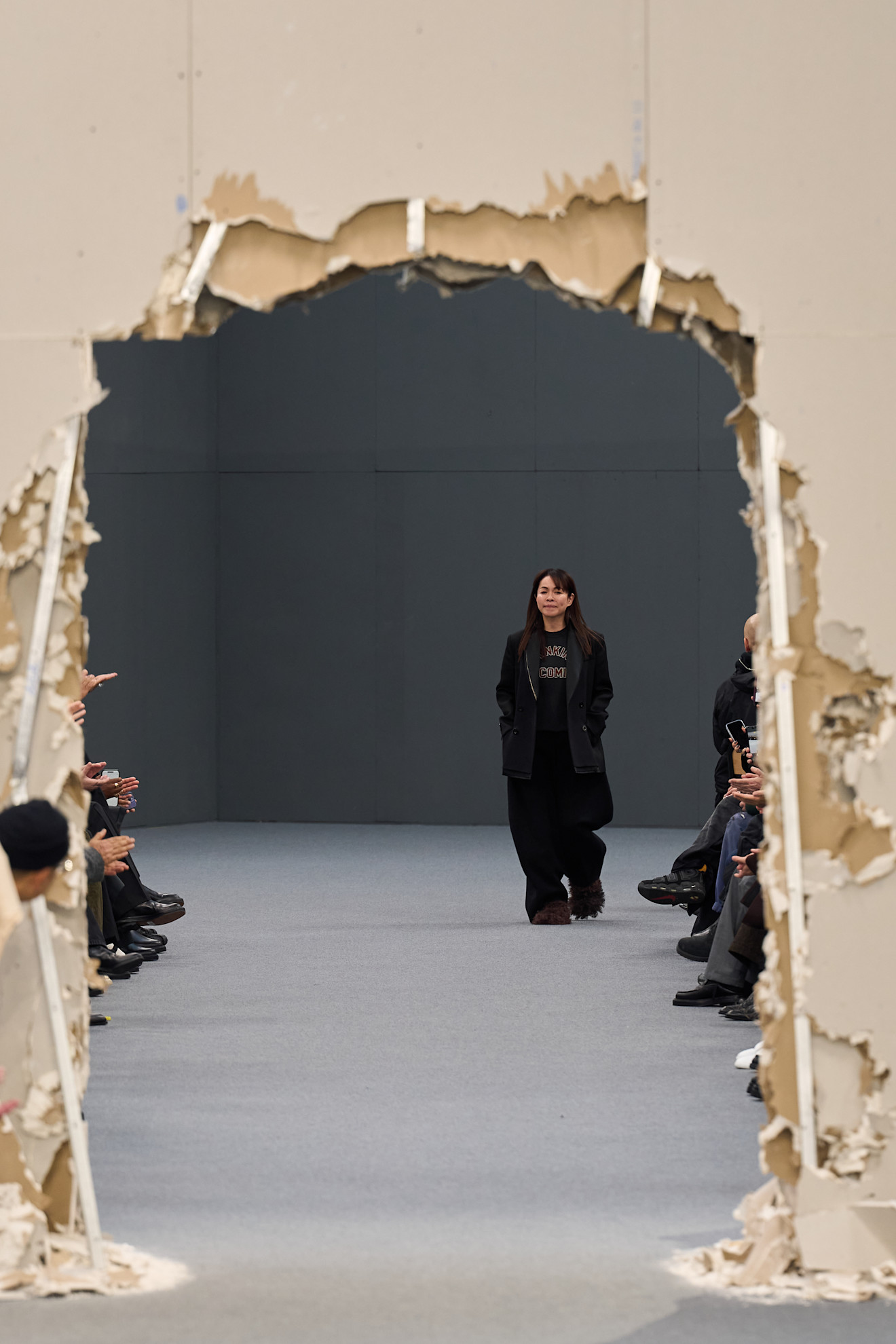 Chitose Abe bu sezon net bir ruh haliyle sahnede. Sacai’yi hibrit formları ve beklenmedik kombinasyonlarıyla tanıtan tasarımcı, Sonbahar/Kış 2026 koleksiyonunda beklentilerden ve yerleşik kalıplardan bilinçli bir kopuşa getiriyor. Le Carreau du Temple’da gerçekleşen defilede, mekanın bölücü duvarlarındaki dramatik darbe izleri bu tavrı fiziksel olarak da görünür kılıyor: Yıkmak, yeniden inşa etmek için.