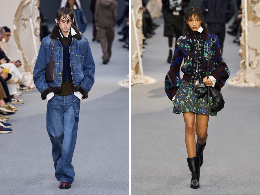 Levi’s ile süren işbirliği bu sezon da öne çıkıyor. Sert, koyu renk denim; yapılandırılmış ceketlerde, deri biker detaylarıyla birleşiyor. İspanyol paça denim pantolonlar ise klasik bir pantolon gibi stilize edilerek gündüz–gece arasındaki sınırı bulanıklaştırıyor. A.P.C. ile yapılan işbirliğinde ise Jessica Ogden’ın patchwork yorganlarından ilham alan yeni bir kumaş geliştiriliyor. Bu desenler mini ve maksi elbiselerde, şişme montlarda ve geometrik desenlerde karşımıza çıkıyor.