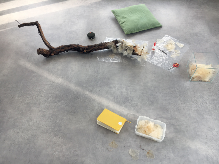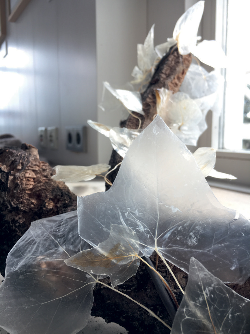İnsan-doğa ve yaşam-ölüm ilişkisine de yeni bir form kazandırmayı amaçlayarak ilk adımı attım. İnsanlar için organ üretilmesi amacıyla geliştirilen bilimsel proje kapsamında yayınlanmış bir makaleden (“Crossing kingdoms: Using decellularized plants as perfusable tissue engineering scaffolds”/ “Krallıkları geçmek: Hücresizleştirilmiş bitkileri perfüze edilebilir doku mühendisliği yapı iskeleleri olarak kullanmak”) yola çıkarak hazırladığım bu projede, bitki yapraklarının insan için yeni bir beden olarak konumlandırılması konusuna odaklanıyorum. Çevreden topladığım yaprakları, bir biyokimya uzmanı ile birlikte laboratuvar ortamında geliştirdiğimiz özel bir solüsyon içinde bekleterek hücresizleştiriyor ve yeni organ geliştirme çalışmalarında kullanılabilecek bir “ev” haline getiriyoruz.