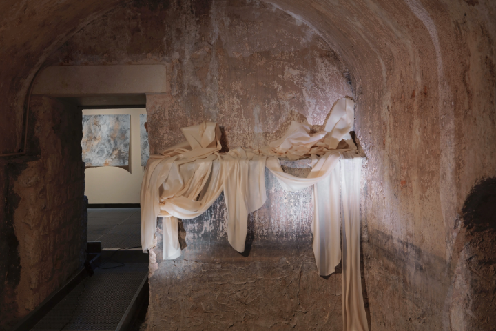 Serginin final noktası ise hamamın bahçesinde yer alan geçici yerleştirme: “Omphalos”. Kubbelere bakan bu açık alan yerleştirmesinde metal bir iskelete gerilmiş balmumu drapelerle hayali bir tapınak yaratılmış.