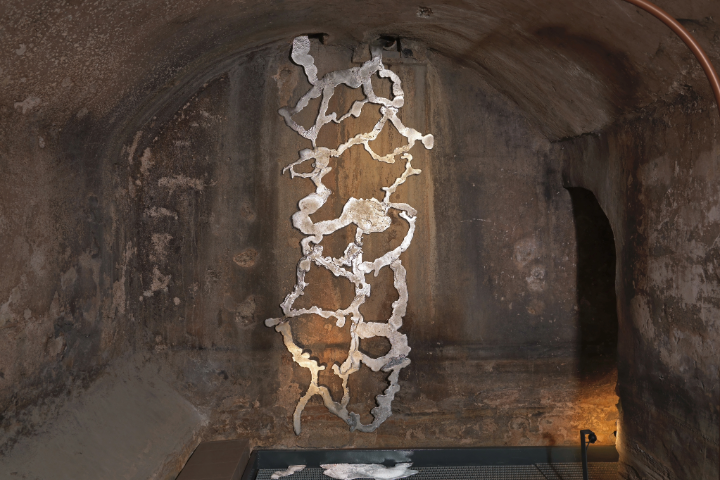 Minchin’in balmumu perdeleri hamamın girişinde sembolik bir eşik oluşturuyor. Bu perdeler yalnızca görsel değil, aynı zamanda dokunsal bir deneyim yaratıyor, sanki yapının cephesi soyulmuş ve içeride sergileniyor gibi. Sanatçı, balmumu ve kalayı “benzer karakterlere sahip malzemeler” olarak tanımlıyor: her ikisi de hassas, dönüşebilir ve zamanla form değiştiren malzemeler.