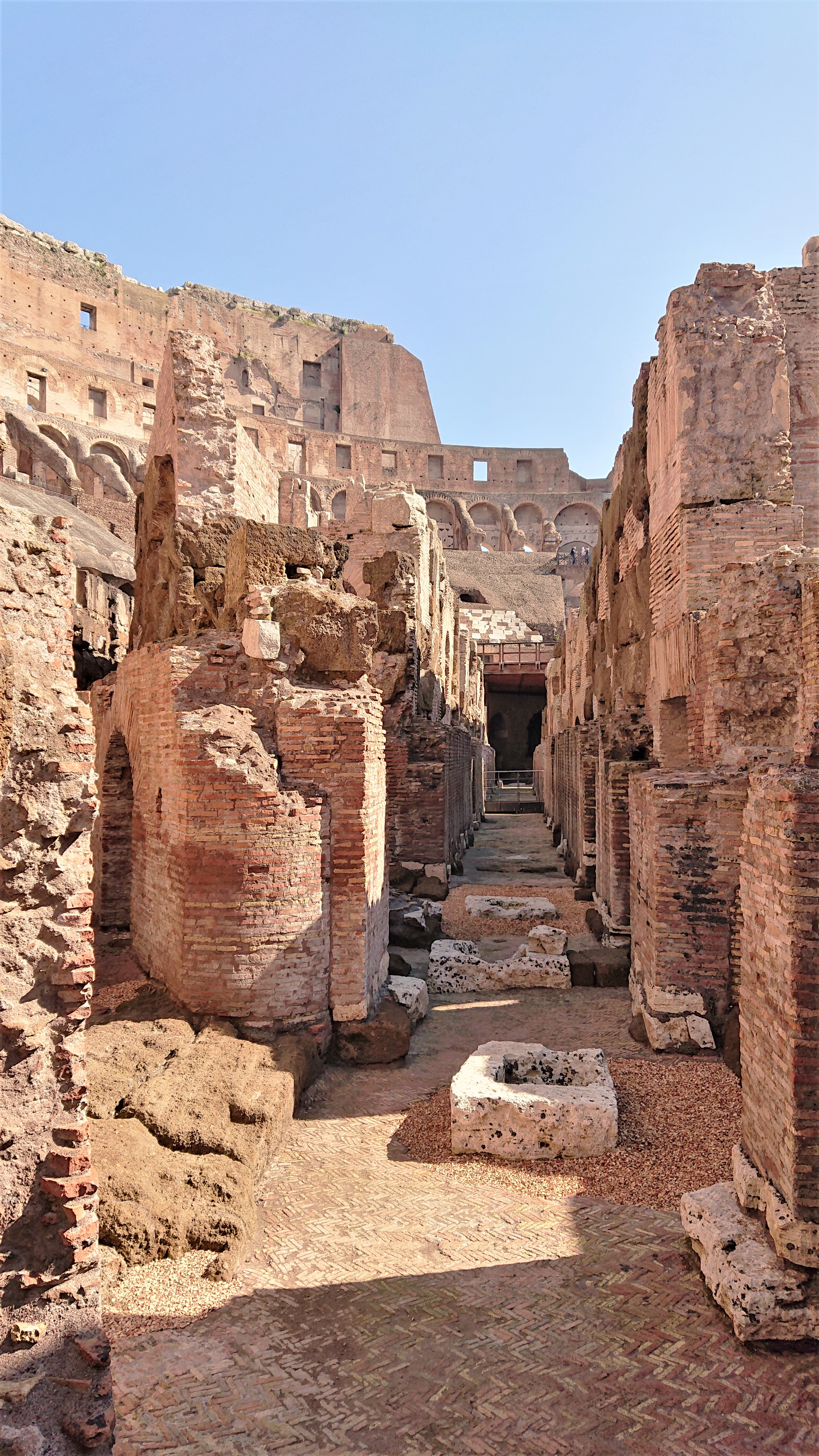 Kayıtlara geçen son gösteri tarihi olan MS 523'e kadar arenada gerçekleşen görkemli gösterilerin sahne arkası olarak kullanıldığı için seyirciler yeraltı geçitlerini görme fırsatı bulunmuyordu. 50.000 ila 75.000 seyirci kapasiteli Kolezyum, erkeklerin, hayvanların ve sahne donanımının arenadaki görünümü için kullanılan bir dizi teknolojik cihazla donatıldı. Flavian çağına kadar uzanan ekipmanlar arasında, yeraltı bölgesinin geçitlerine yerleştirilmiş asansör düzeneklerini görmek hala mümkün. Bunlar sırasıyla 24 hareketli platform ve vinçlerle kaldırılan 28 ahşap kafesli asansörden oluşuyor.