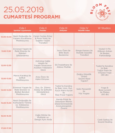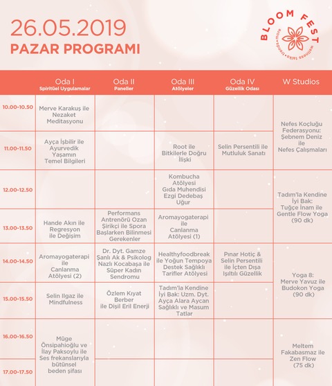 Hızla büyüyen dijital wellness sitesi www.livetobloom.com ve Institute for Integrative Nutrition’dan ‘’Bütünsel Sağlık Koçluğu’’ sertifikalı Marka İletişim Danışmanı Pınar Özdemir Hotiç işbirliğiyle tasarlanan BloomFest, Wellness Deneyim Etkinlikleri Serisi olarak tanımlanıyor.