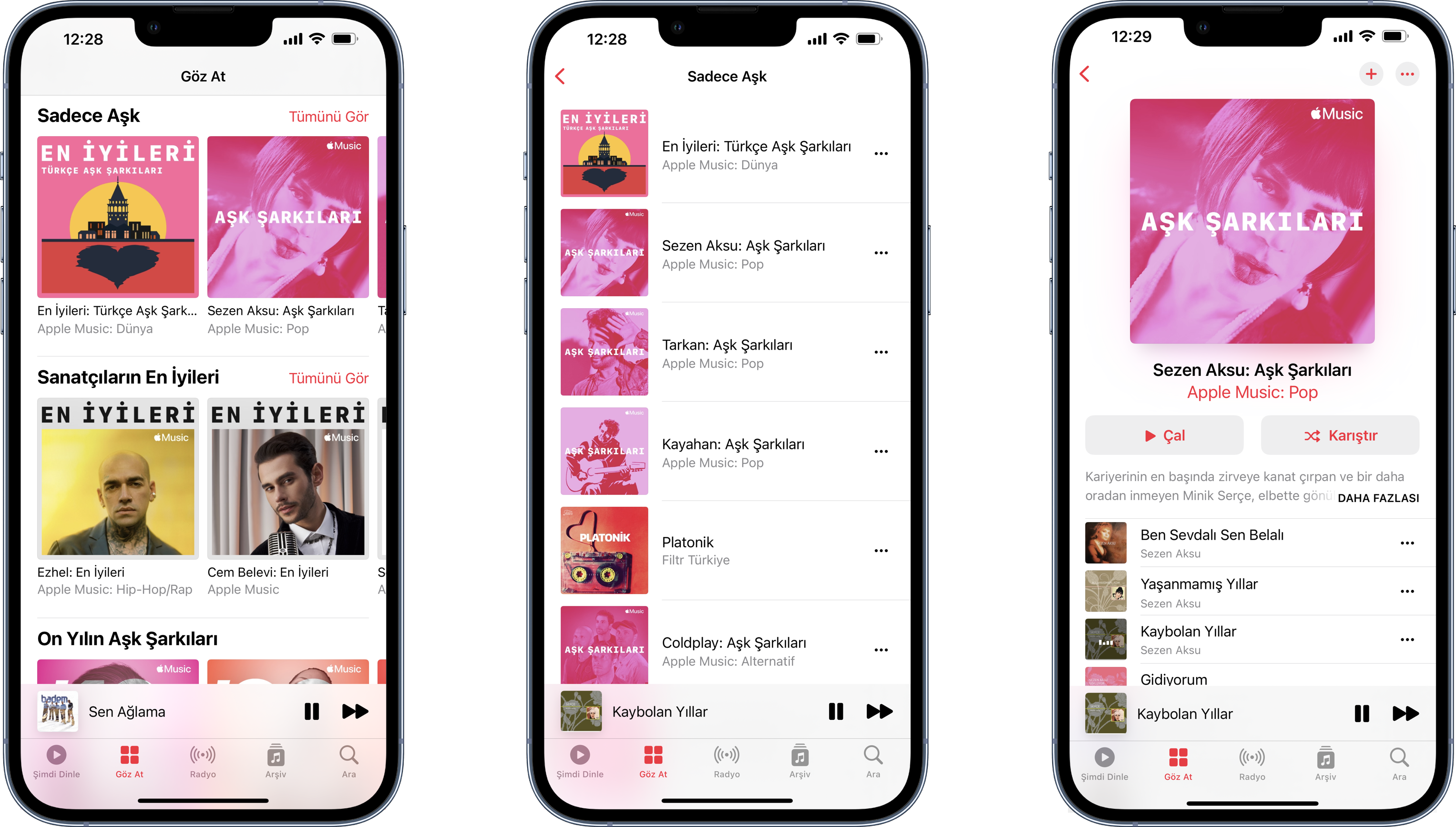 Göz At bölümündeki Sadece Aşk bölümünden ise En İyileri: Türkçe Aşk Şarkıları listesinin yanı sıra Sezen Aksu’dan Teoman’a ve Kenan Doğulu’ya birçok yerli sanatçının oluşturduğu özel dinleme Aşk Şarkıları listelerine ulaşabilirsiniz.