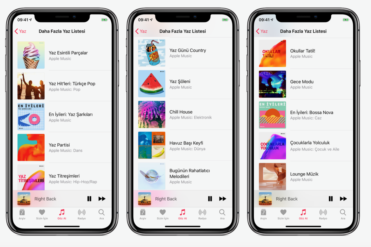 “Yaz Notaları" bölümünde ayrıca yaz aylarında dinlemek isteyeceğiniz parçalardan oluşan şarkı listeleri, Yaz Esintili Parçalar, Akustik Yaz, Yaz Hitleri: Türkçe Pop, En iyileri: Yaz Şarkıları, Yaz Havası, Güneşi Hisset, Havuz Başı Keyfi gibi Apple Music küratörleri tarafından hazırlanmış, modunuza göre dinlemek isteyeceğiniz şarkılarla yazın keyfini daha fazla çıkartabilirsiniz.