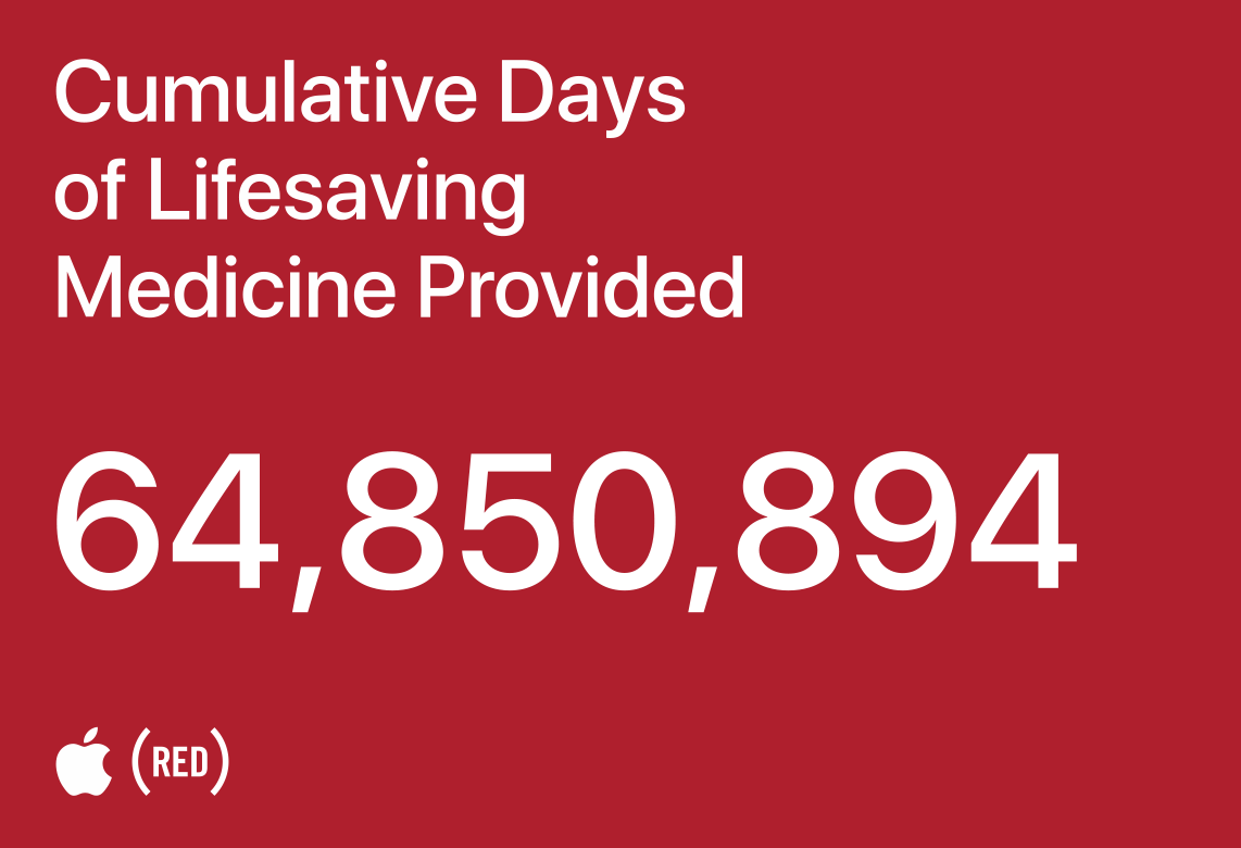 (RED), 2006’daki kuruluşundan bu yana tüm dünyada HIV ile yaşayan 37 milyondan fazla insana yardım etmek için yorgunluk nedir bilmeden çalıştı. Bu Dünya AIDS Günü’nde, Apple Global Fund için toplanan 30 milyon ABD dolarının üzerindeki rekor bağış topladığı seçtiğimiz yılı kutluyor. Bu tutar, HIV virüsünün annelerden yeni doğan çocuklara aktarılmasını önleyen ARV ilaçlarının 144 milyon gün verilmesini sağlıyor. Geçtiğimiz 11 yıl içinde, Apple yaşam kurtaran bu ilaçların hastalara 475 milyon gün boyunca verilebilmesini sağlayacak kadar ürün satın aldı.