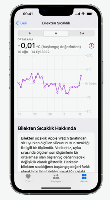 Apple Watch’un sağlığımıza daha yakından bakmamızı sağlayan yepyeni "Kadın Sağlığı için Bilekten Sıcaklık Algılama” ve “AFib (Atriyal Fibrilasyon) Geçmişi" özellikleri Türkiye’deki Apple Watch kullanıcılarıyla buluştu. Bilekten sıcaklık algılama özelliği Apple Watch Series 8 ve Apple Watch Ultra modellerinde, AFib Geçmişi özelliği ise watchOS 9’u destekleyen tüm Apple Watch modellerinde bulunuyor.