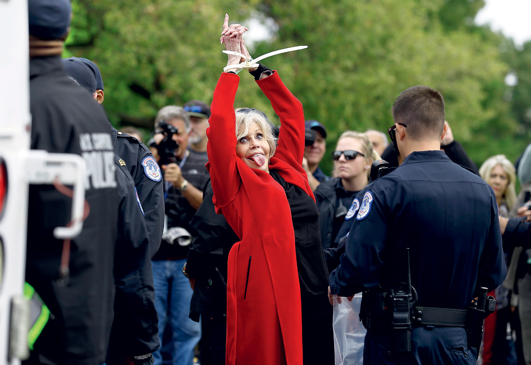 Ve Jane Fonda… Her cuma başkent Washington’da katıldığı protestoların neticesinde yeni bir kelepçeli fotoğrafı eklendi albümüne. Fotoğraflarda ona kimi zaman süpermodel Amber Valetta kimi zaman da oyuncu Rosanna Arquette eşlik etti. Amaçları sivil itaatsizlik yoluyla iklim krizine dikkat çekmek elbette. Basın kimi zaman onu şov yapmakla, gereksiz PR malzemesi üretmekle suçladı. O zarif bir şekilde şöyle dedi: “Ünlü olmanın bir yanı da sürekli basında yer alarak kendinizi göstermektir. Ben de ünlü olduğum için katılıyorum protestolara. Gücünüzü kullanmak tanınmış bir kişi olarak üstlenmek zorunda olduğunuz bir sorumluluktur. Özellikle de geleceğimiz tehlike altındayken.”