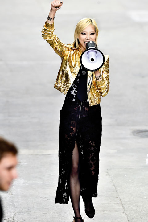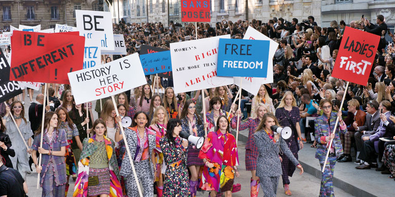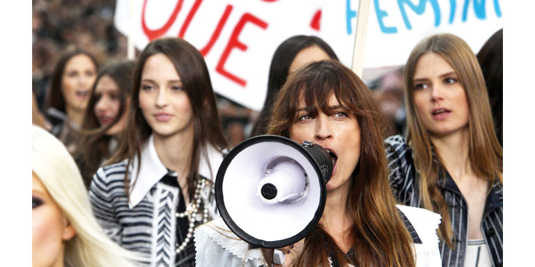 Chanel 2015 defilesinde Caroline de Maigret en ön sırada elinde megafonla kadın hakları için insanlara sesleniyor.
