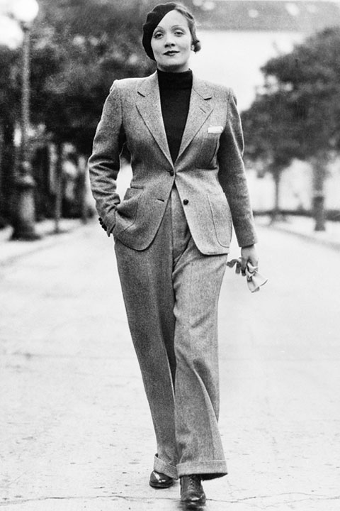 1930’lu yıllarda pantolon giyinmek kadınlar için tabu sayılıyordu. Marlene Dietrich isyankar ruhuyla toplum içinde pantolon giydiğinde bir seferinde neredeyse tutuklanıyordu. Belki onun bu başkaldırısı olmasa şu an sadece bize izin verilen şekilde, “hanım hanımcık” giyiniyor olurduk. Tabii ki bu olayda isyanı başlatan Coco Chanel’in ta kendisi oluyor. Pantolonu erkek giyiminden, kadınların sınırlarına da sokan bir efsane olduğunu unutmamak gerek.