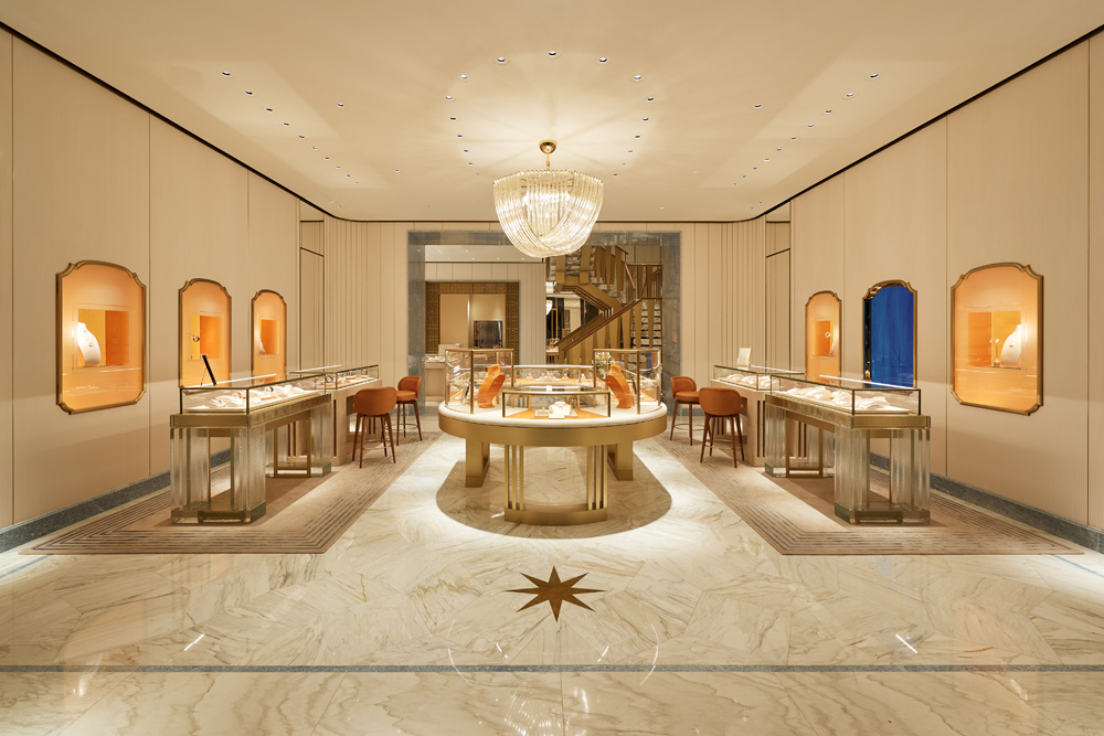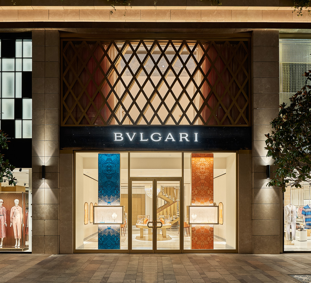 Tavanda ise, saten altın pirinçten geometrik bir elmas eşkenar dörtgen desenli ağa sahip bir avize yer alıyor. İtalyan işçiliğinin incelikli örneği olan Venini'nin muhteşem bu aydınlatması, butiğin odak noktasına konumlanırken, aynı zamanda müşterilerin ikonik Bulgari mücevherlerini inceledikleri dairesel inceleme tezgâhını da taçlandırıyor.