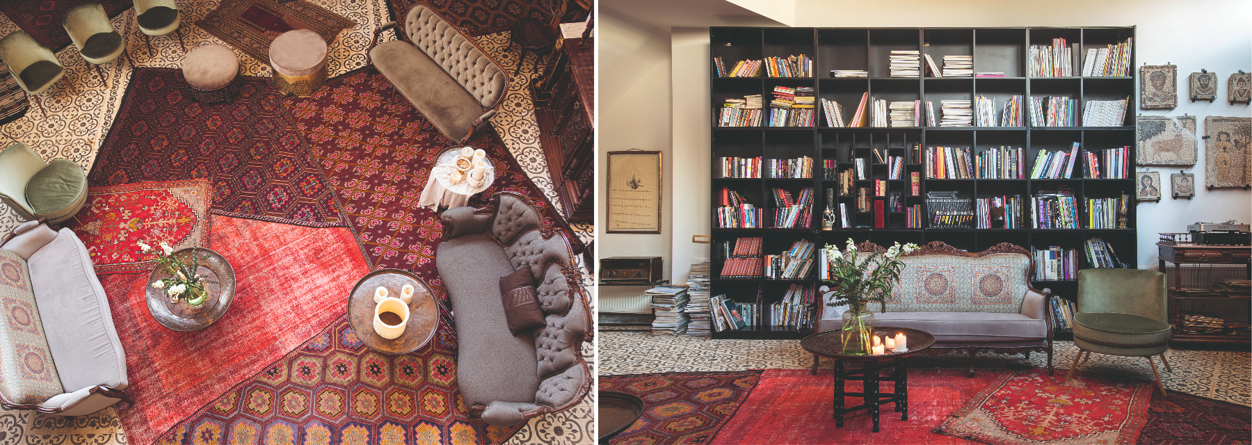 Evdeki birbirinden farklı köşeler, her türlü keyfe hitap ediyor. Geniş kitaplık salona hakim konumda olup çeşitli mozaikler duvarda görülüyor. Ev sahiplerinin halı ve kilim koleksiyonu eve yayılmış.