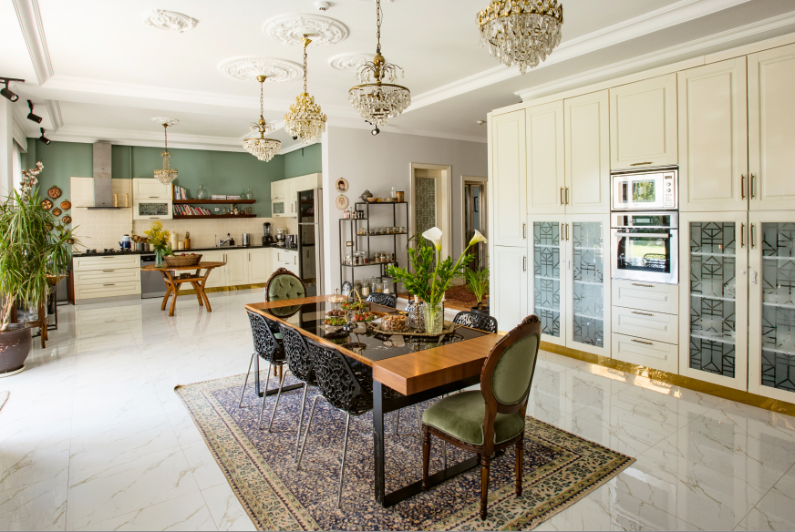 Ev sahiplerinin gurmeye düşkünlüğü evlerindeki geniş mutfak ve üç ayrı yemek alanından belli oluyor. Kristal avizeler, farklı sandalyeler, oryantal halı ve bakırlar mutfakta yer alıyor. Simay Bülbül’ün bu sofrasında çeşitli ikramlar yer alıyor.
