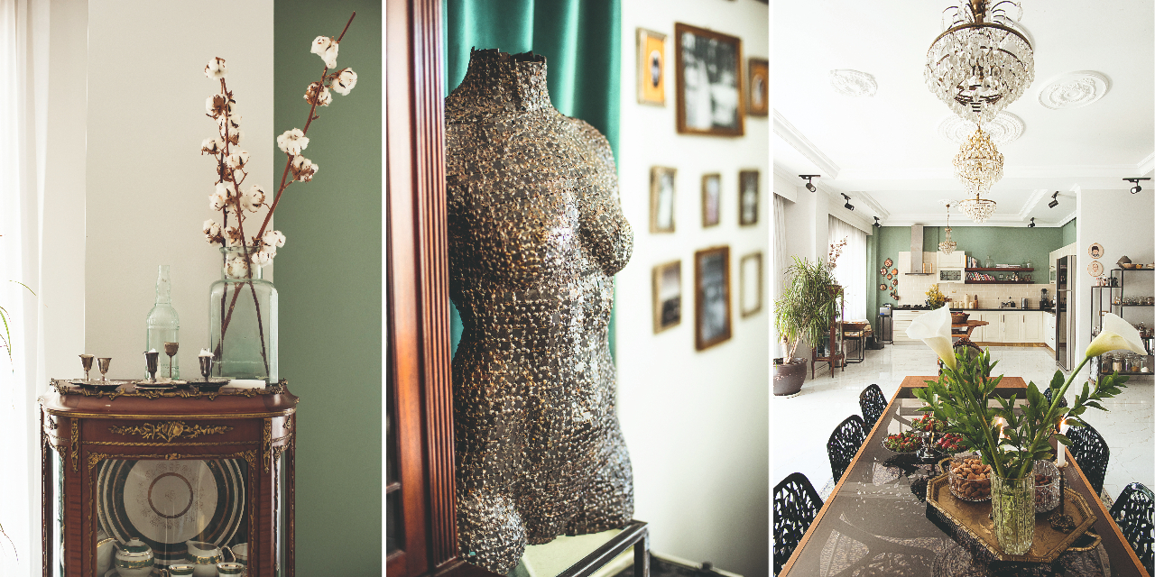 Antikalar ve otantik parçalarla dekorasyonun harmanlandığı evde, özel koleksiyon parçalar bulunuyor. Modern bir anlayış sıcak ve samimi bir ambiyans yaratıyor.