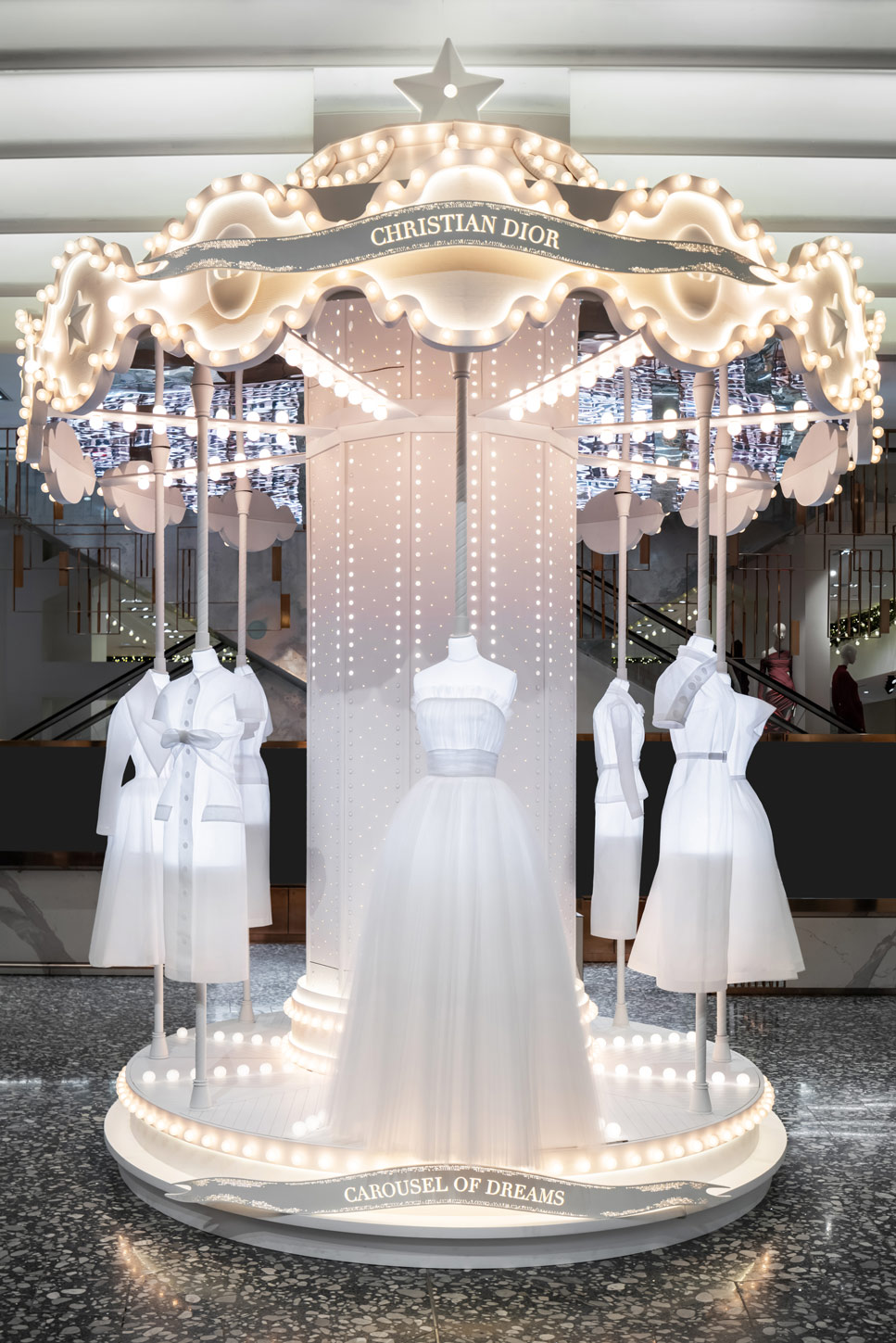 Minyatür sanatına ve sonsuz titizlikteki detaylara bir övgü niteliğindeki benzersiz skenografi, Beşinci Cadde binasının efsanevi vitrinlerini kaplıyor ve adeta büyütüyor. Böylelikle, Dior'un tüm alanlarında şenliklerin ruhuyla parlayan bir küçük harikalar tiyatrosu bolluğu ortaya çıkıyor. Bu şiirsel virtüözlük iç mekana da uzanıyor: Zemin katta, neredeyse beş metre yüksekliğindeki gerçek bir atlıkarınca gün boyunca ziyaretçileri içeri davet ederken; tamamen güzelliğe adanmış geçici bir alan, Christian Dior Parfums'ün ikonik kreasyonlarını çeşitli animasyonlarla öne çıkarıyor. Cüretkârlığı ve yeniden keşfi bir araya getiren bir dizi orijinal parça, bu istisnai adresteki Dior butiklerinde sergileniyor.