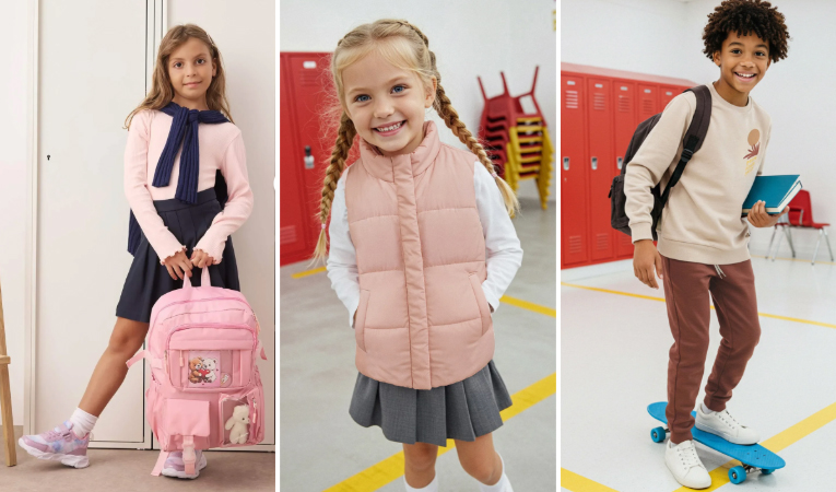 Sırt çantası, beslenme çantası ve kalemlik üçlüsü, okula dönüşün vazgeçilmezleri arasında. Sneakers ve kolej temalı parçalar, hareketli günlerde çocukların enerjisine eşlik ediyor; etek ve babet kombinleri ise şıklığı eğlenceli hâle getiriyor.