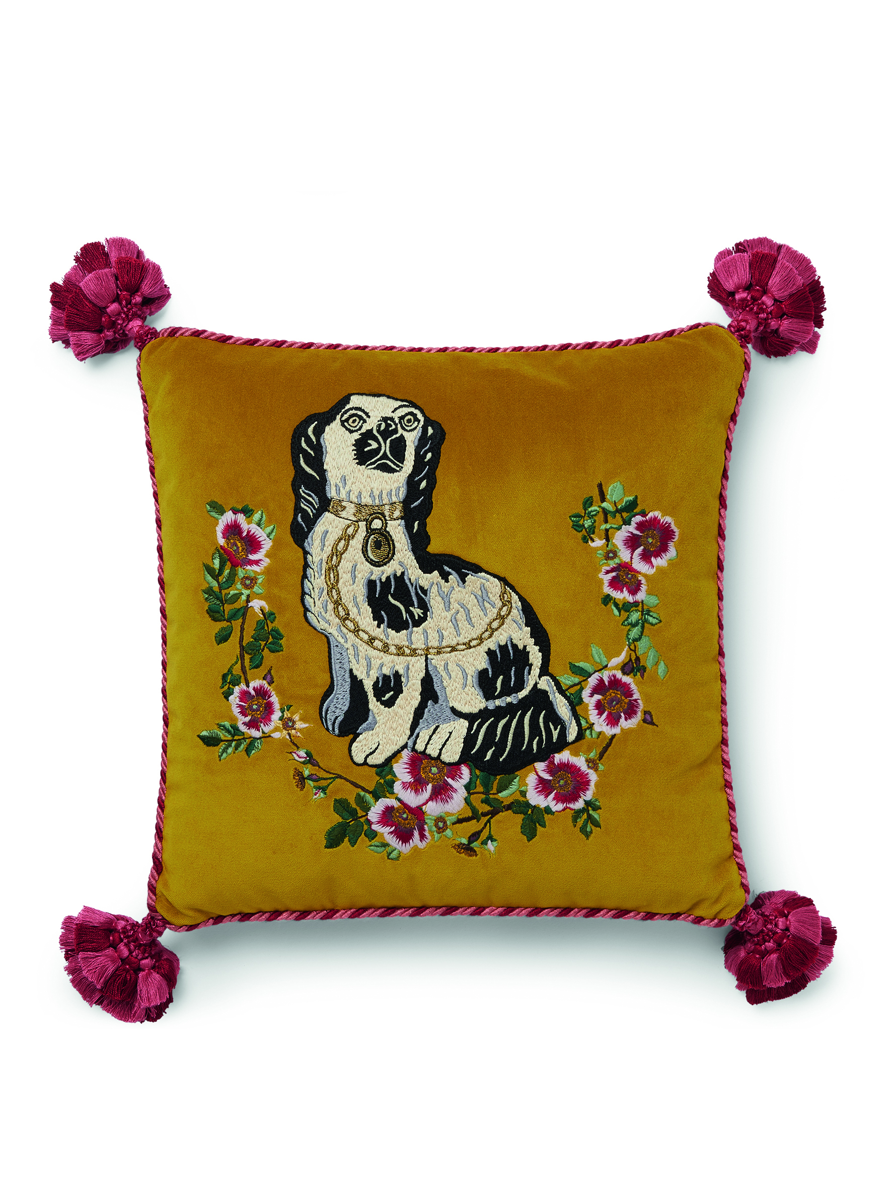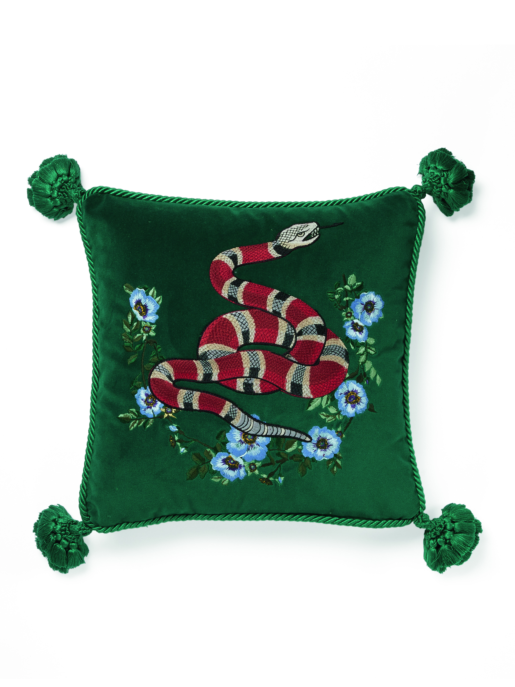 Koleksiyonun kimi püsküllü kimi kalın kenarlı olmak üzere farklı şekillerde ve kalınlıklarda sunulan gösterişli minderleri, şimdi kadife ve yün karışımlı zemin üzerine işlenmiş çok geniş ve zengin bir kanaviçe seçkisiyle geliyor. Minderler üzerine işlenen desenler arasında bir kaplan başı, bir oyuncak ayı, “Maison ‘l’Amour” yazısı ve Kreatif Direktör Alessandro Michele’nin Boston terrierleri olan Bosco ve Orso yer alıyor.