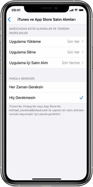 Ayrıca, iTunes ve App Store veya Book Store'dan yapılacak ek satın alma işlemlerinde kullanılan parola ayarlarınızı değiştirebilirsiniz. 1-3 arasındaki adımları uygulayın, ardından Her Zaman Gereksin veya Hiç Gerekmesin'i seçin.