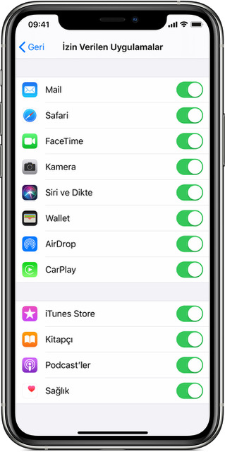 Yerleşik uygulama ve özelliklerin kullanımını sınırlayabilirsiniz. Kapattığınız uygulama veya özellikler silinmez, yalnızca geçici olarak Ana ekranınızdan kaldırılır. Örneğin, Mail uygulamasını kapatırsanız bu uygulama tekrar açılana dek Ana ekranınızda gösterilmez.