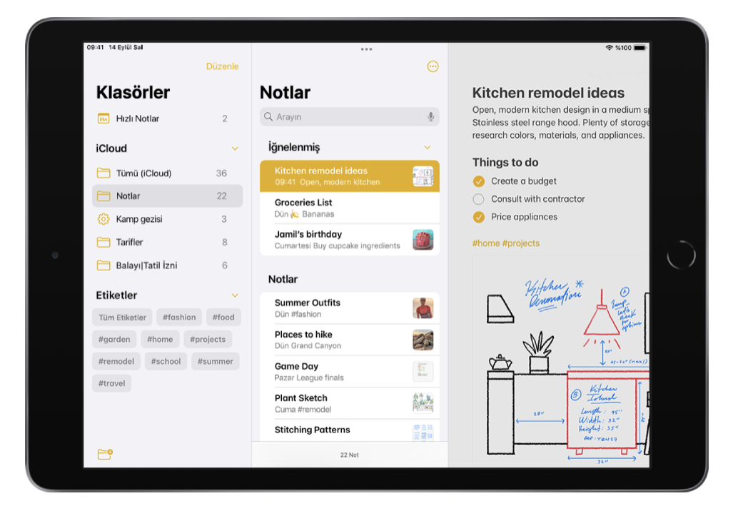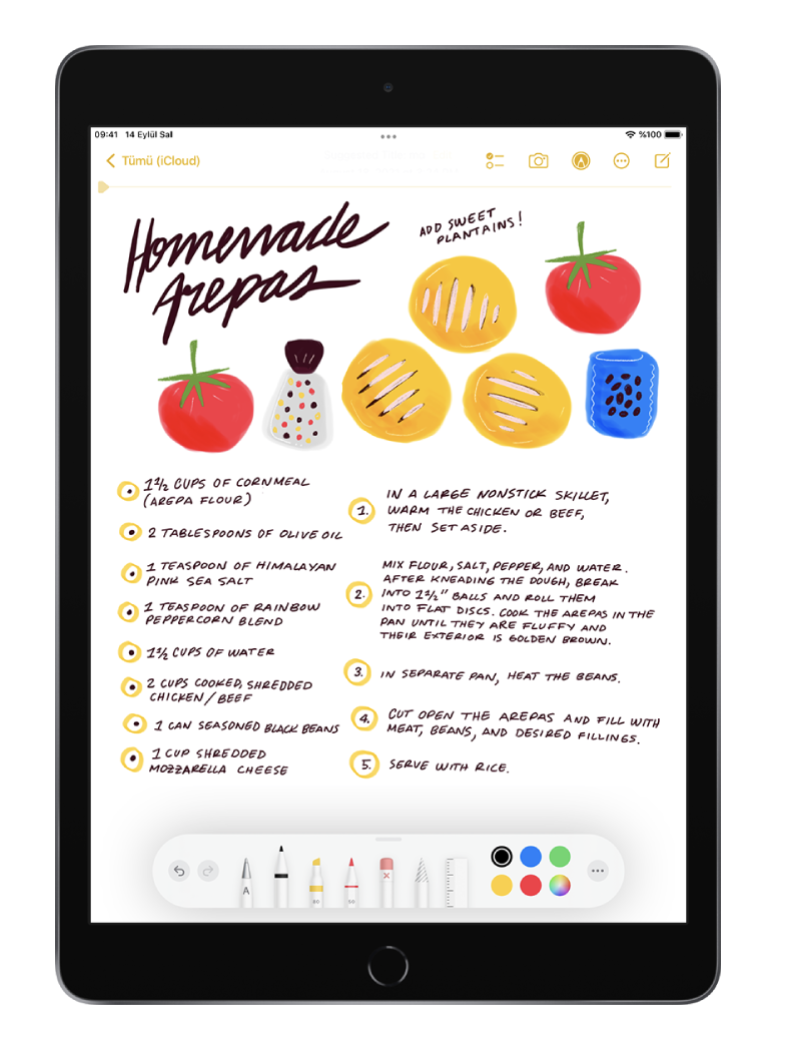 Apple Pencil (desteklenen modellerde) veya parmağınız ile bir eskiz çizmek ya da el yazısı not almak için Notlar uygulamasını kullanabilirsiniz. Çeşitli işaretleme araçlarından ve renklerden seçim yapabilir ve cetvelle düz çizgiler çizebilirsiniz. Ayrıca Apple Pencil ile yazarken el yazınızı klavyeyle yazılan metne de çevirebilirsiniz.