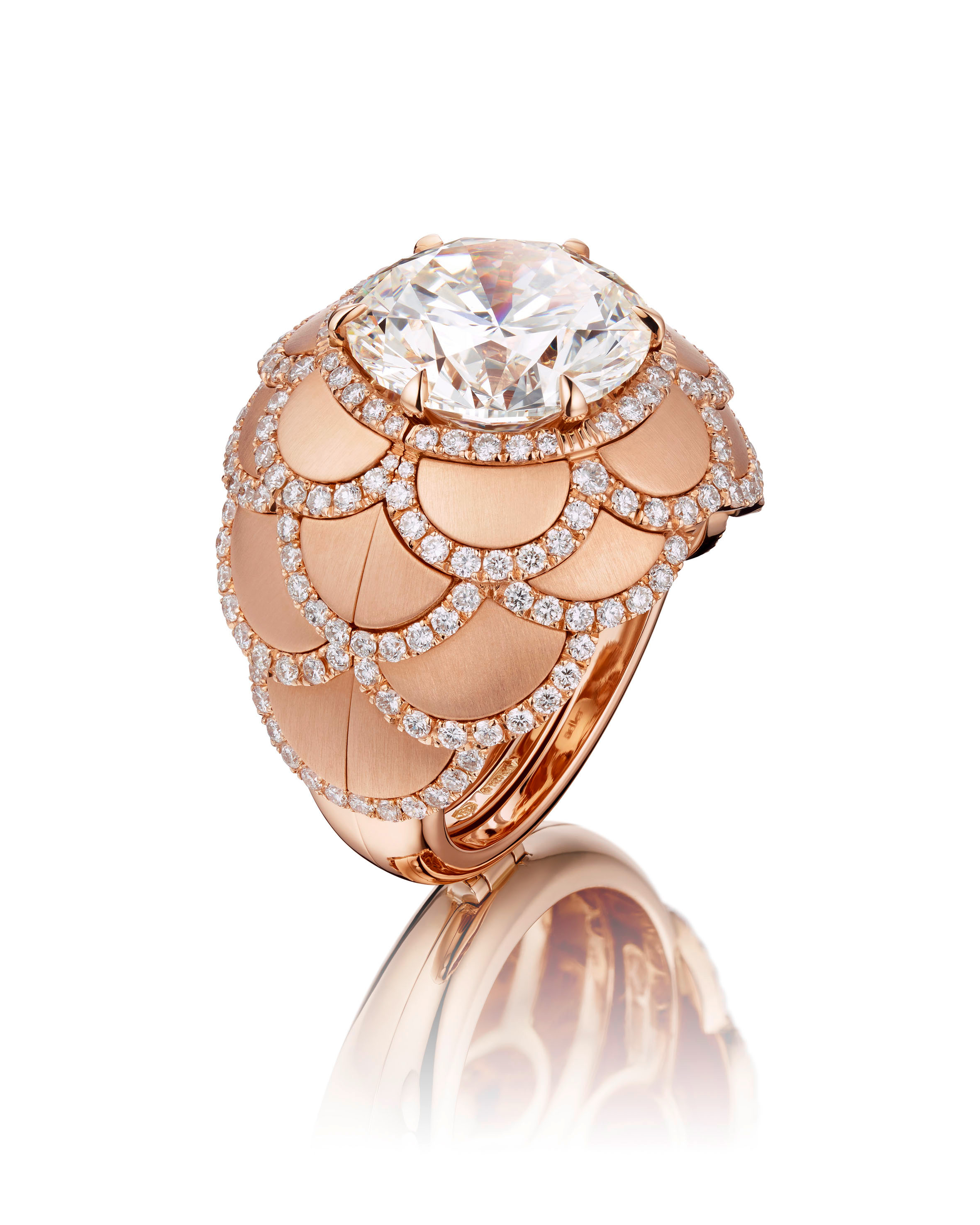 Adler mücevher evi ustalarının hünerli elleriyle çiçek açan bilezik, yüzük ve küpeler, çiçek kokularıyla sarılmış bir japon bahçesini betimliyor. Lekesiz ve dolayısıyla kusursuz mat pembe altın taç yaprakları pırlantalarla bezenmiş. Adler’in 6.90 karatlık şahsiyetli pırlantası ise montürün görkemini perçinliyor. Farklı form ve renk varyasyonlarıyla şiirsel bir çiçek şölenini anımsatan Shinsei, hergün yeniden canlanan dişiliğin bir ifadesi...