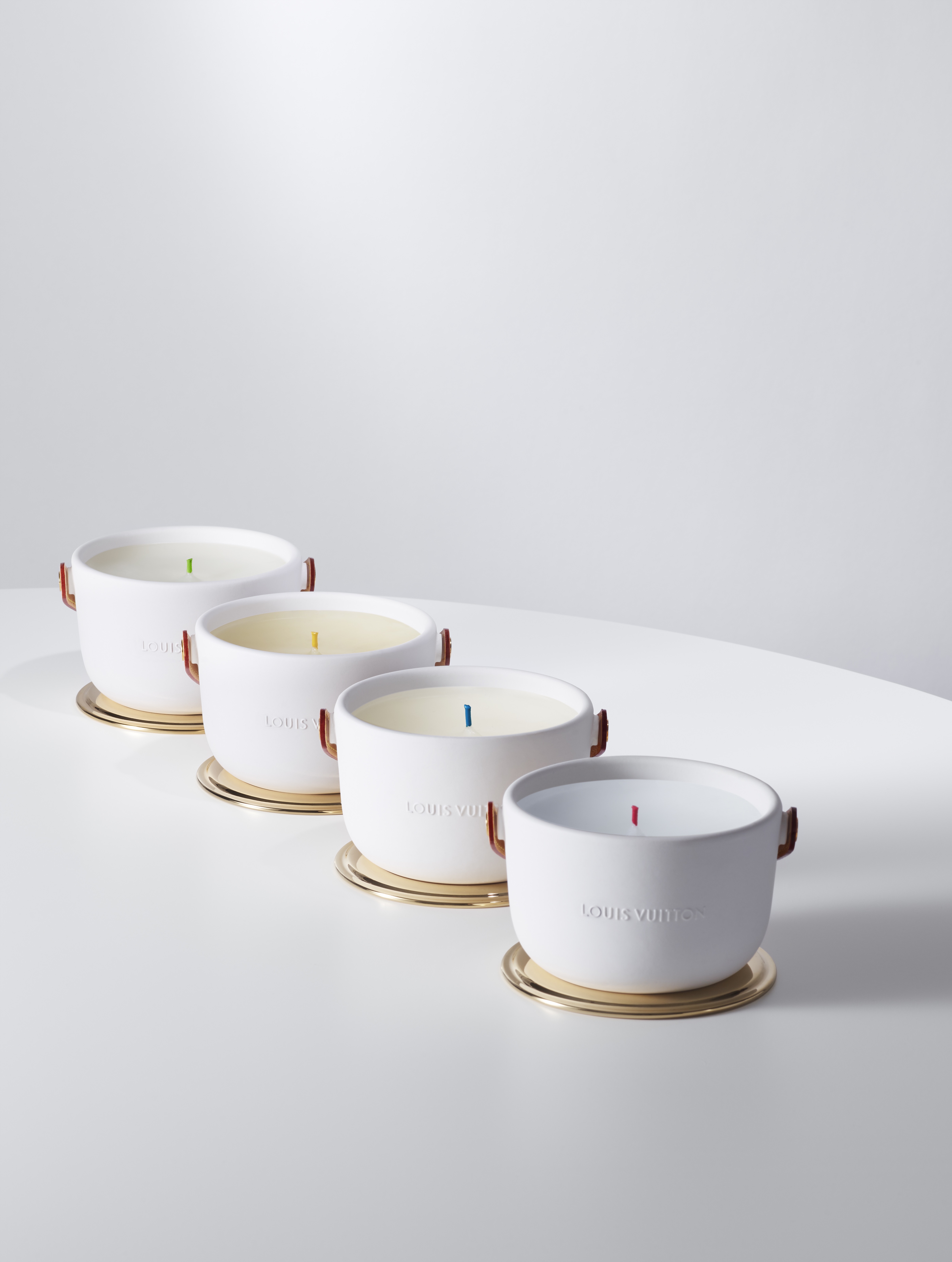 Fransa’nın Grasse kasabasında üretilen mis kokulu mumların her birinin kokusuna göre farklı renkte, zanaatkarların incecik fırçalarla elde boyadıkları fitilleri bulunuyor.  Mumun saf ve mat beyaz formu, altın kaplama kapağın ışıltısı ve natürel derinin sıcaklığıyla tatlı bir kontrast oluşturuyor. Tıpkı seyahatlerden alınan hatıra ürünleri gördüğümüz an o özel yerlere, anılara gitmemiz gibi, Louis Vuitton seramik mumlar da evde çok özel bir etkisi olması için tasarlandı
