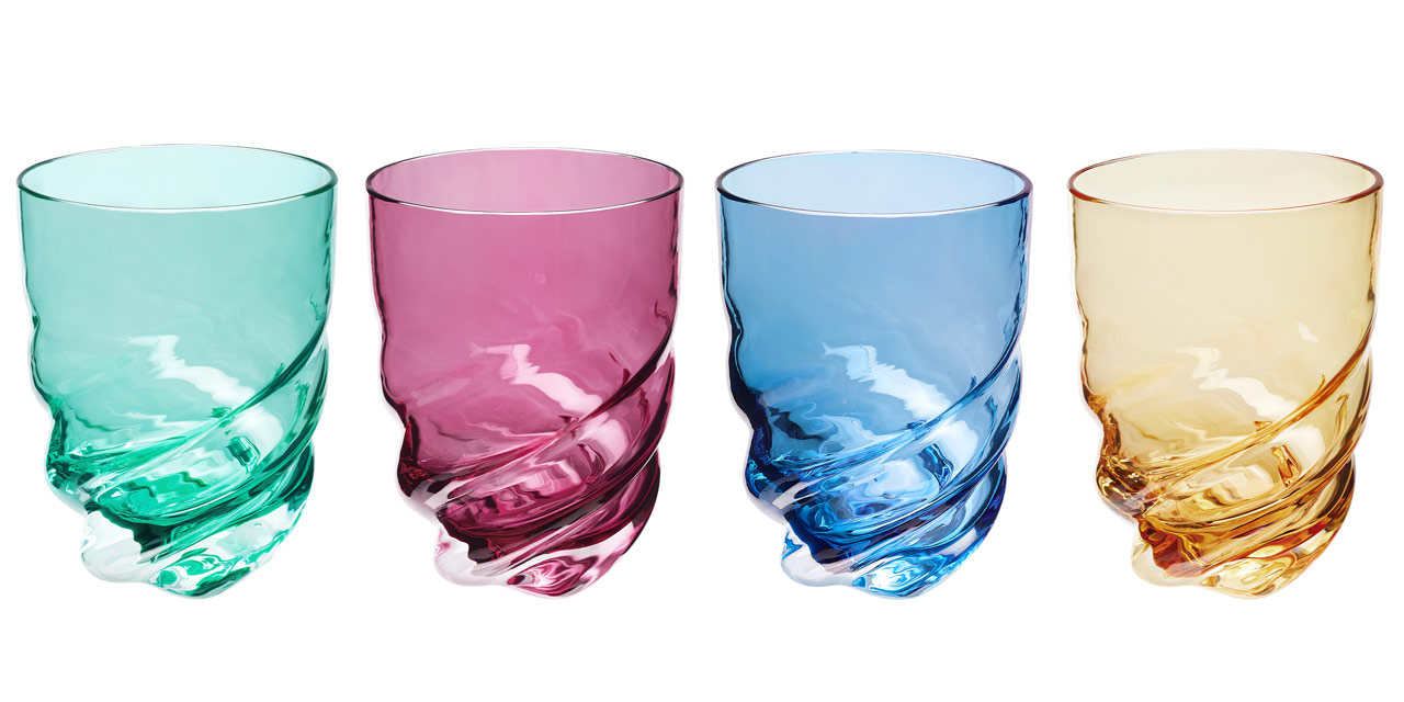 Louis Vuitton'un “Twist Glass” bardakları şeffaf kristal versiyonunun yanı sıra büyüleyici safir mavisi, kehribar, zümrüt ve Venedik yakutu renklerinde de mevcut olmakla birlikte her yuduma özel bir dokunuş katan bir sofistikasyonu yansıtıyor. Bardakların dinamik tasarımı, altındaki monogram çiçeğinden yükselerek dönen form ile görsel ve dokunsal deneyime sanatsal bir boyut kazandırıyor.