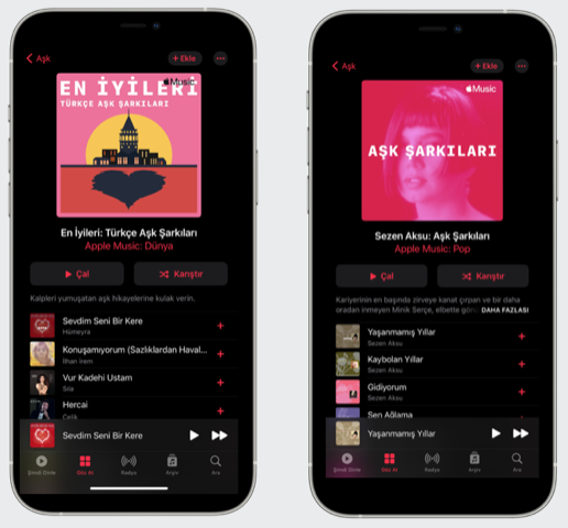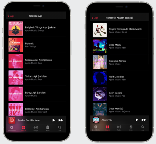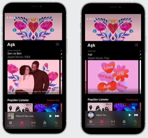 Apple Music 14 Şubat’a özel hazırladığı “Aşk” odası içinde dinlemek isteyeceğiniz tüm şarkıları bir araya topluyor. Konuk küratörler tarafından hazırlanan listeler, kalpleri yumuşatan aşk hikayeleriyle en iyi Türkçe aşk şarkıları, ayağınızı yerden kesecek aşk şarkıları, aşkın her evresine hitap eden pek çok şarkı bu odada Sevgililer Günü'nü unutulmaz yapmaya aday. Sezen Aksu’dan Kenan Doğulu’ya en sevdiğiniz yerli sanatçıların aşk şarkıları seçkileri, Adele’den The Beatles’a dünyaca ünlü unutulmayan aşk şarkılarına, romantik akşam yemeği için şefin seçimiyle buluşmanızı renklendirecek pek çok alternatif içinden sizi ve sevdiğinizi mutlu edecek şarkıyı bulacaksınız.