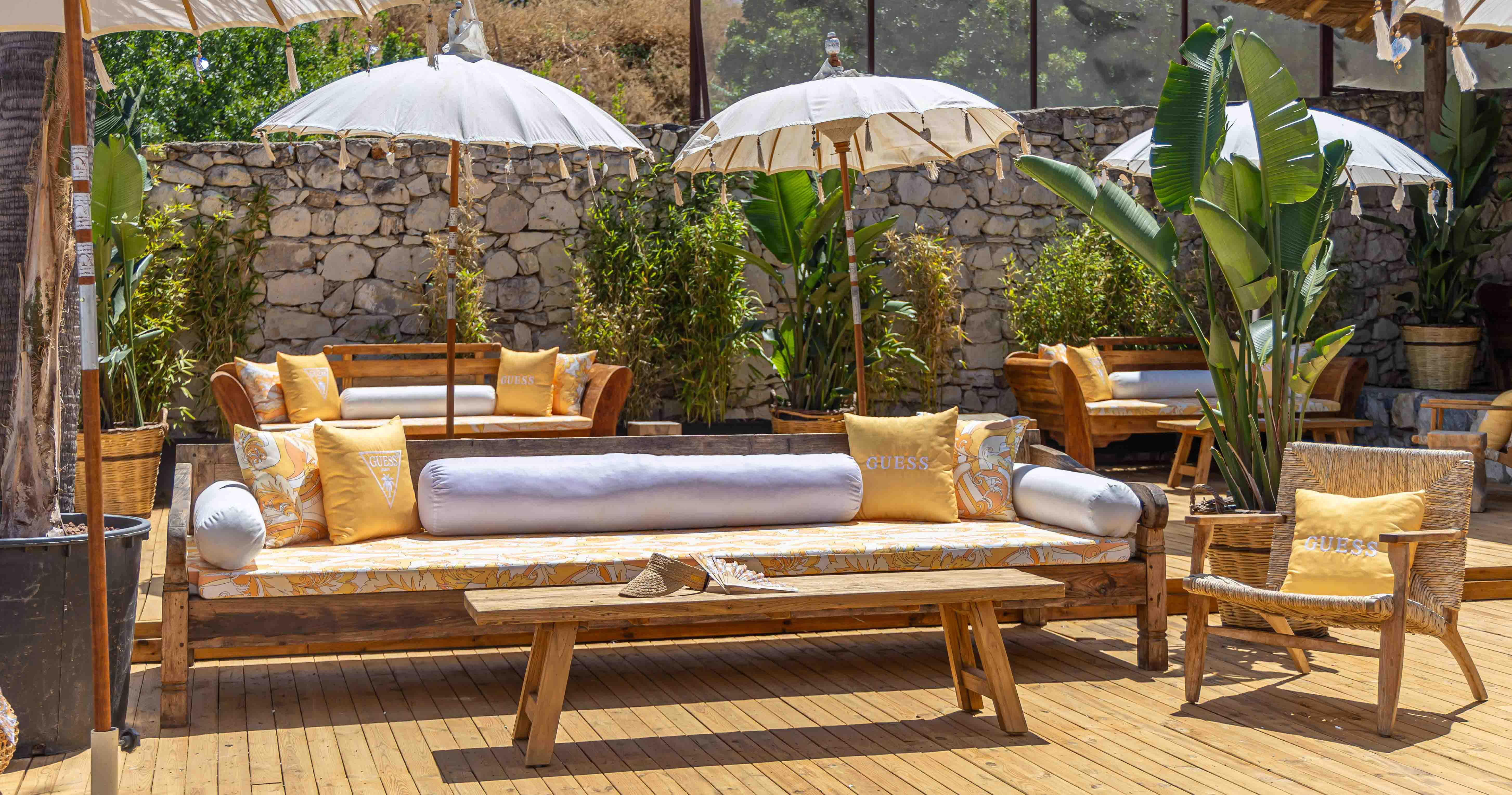 Çeşme’de eşsiz Aya Yorgi koyunda bulunan Yuzu Beach bohem Buddha konseptiyle ve geniş iskelesiyle öne çıkıyor. Guess; yüzme ve güneşlenme alanında kullandığı kum ve sarı-turuncu renk kartelası ile Yuzu Beach’e kusursuz bir uyum sağlıyor.
