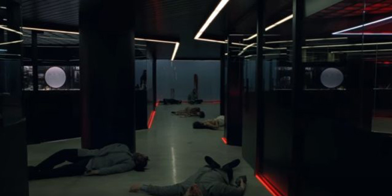Maeve, cesetlerle dolu odada silah tutuyor.