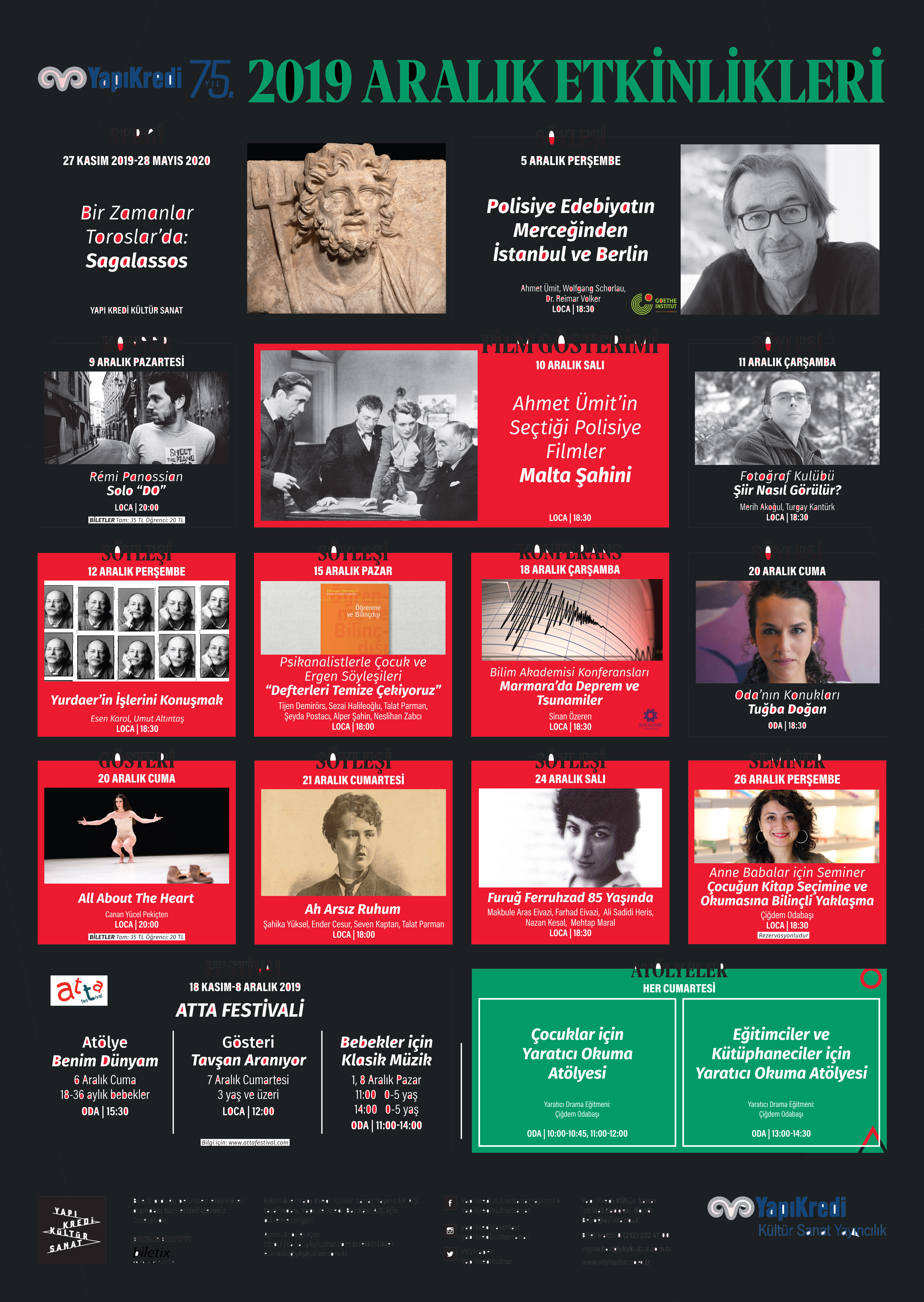 YKKSY’nin etkinlik programında 10 Aralık Salı günü “Yapı Kredi 75. Yıl Buluşmaları” kapsamında Ahmet Ümit’in seçtiği Malta Şahini filminin gösterimi ve 11 Aralık Çarşamba günü ise Fotoğraf Kulübü söyleşisi var. 12 Aralık Perşembe günü yapılacak söyleşide Yurdaer Altıntaş anılırken, 15 Aralık Pazar günü Öğrenme ve Bilinçdışı tartışılacak.