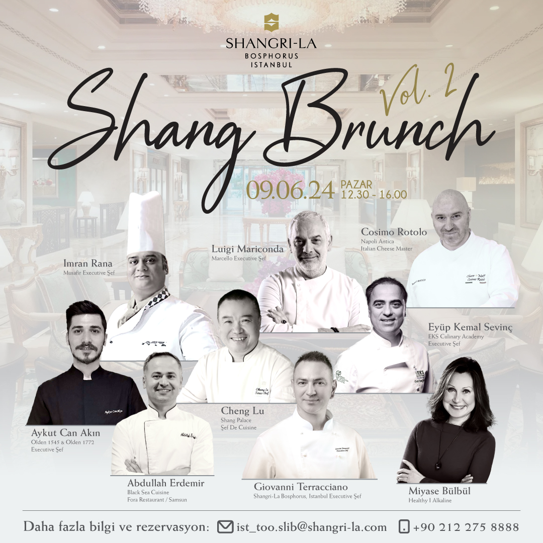 Shang Brunch Vol.2’de; Shangri-La Bosphorus, Istanbul Executive Şef’i Giovanni Terracciano ve Shang Palace Chef de Cuisine’i Lu Cheng, İtalyan mutfağını temsilen Marcello Executive Şef’i Luigi Mariconda, Hindistan mutfağını temsilen Musafir Executive Şef’i Imran Rana, Türk mutfağını temsilen EKS Mutfak Akademisi Şef’i Eyüp Kemal Sevinç ve Olden 1772 Executive Şef’i Aykut Can Akın, Karadeniz mutfağını temsilen Fora Samsun Şef’i Abdullah Erdemir, İtalyan peynirleri sunumuyla Napoli Antica Şef’i Cosimo Rotolo ve Healthy & Alkaline kategorisini temsilen Miyase Bülbül yer alacak.