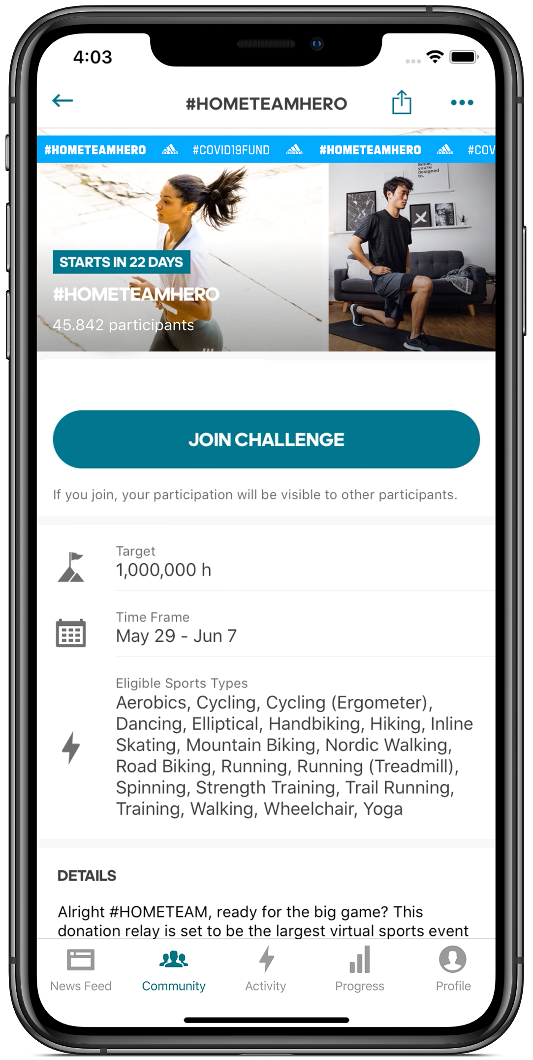 Dünyanın her yerinden katılım sağlanabilen #HOMETEAMHERO hareketine aktif olunan saatlerle katkıda bulunmak için adidas Running ya da adidas Training uygulamasını kullanmak yeterli. Bu uygulamaların içerisinde yer alan #HOMETEAMHERO meydan okumasına kayıt olduktan sonra; 29 Mayıs-7 Haziran arasında yapılan her egzersizi listeden seçip uygulamayı egzersiz boyunca açık tutarak hedeflenen süreye ve dolayısıyla bağışa katkıda bulunmak mümkün.