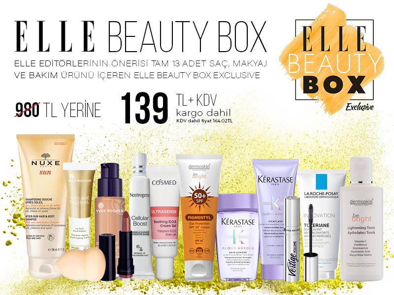 Beauty Box için ELLE Türkiye editörlerinin deneyip özel olarak seçtiği 980 TL değerindeki ürünler, sadece 139 TL+KDV (KDV Dahil 164.02 TL)