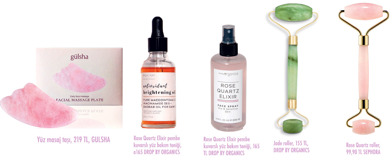 Piyasada farklı kristallerle, farklı renklerde birçok kristal masaj aleti bulunuyor. En çok tercih edilenler arasındaysa pembe kuvars (rose quartz) ve yeşim (jade) var. Peki kristalimizi neye göre seçmeliyiz? Sorunun cevabını Drop by Organics markasının kurucusu ve formülatörü Evren Dalgıç’tan dinleyelim: “Aslında biraz mistik gibi dursa da, kristallerin etkisinin sihir veya mucizelerle bir ilgisi yok. İşin özü tamamen vibrasyonların bilimi ile alakalı. Taşıdıkları yüksek enerjiler sayesinde cilt bakım ürünlerinde içerik olarak kullanılan kristaller, ciltten negatif enerjiyi atıp, detokslayıp, yoğun pozitif, iyileştirici ve güzelleştirici etkisini bedenimize aktarmakta şahane bir aracı. Burada en merak edilen konulardan biri de hangi taşı seçmeli? Kristaller spiritüel ve çok yüksek frekanslı olduğu için aslında hangisine yakın hissederseniz onu seçebilirsiniz. Ortak özellikleri; hepsi cilde masaj yaparak kolajeni uyarıyor ve anti-aging etkiye sahip. Bunun yanında gözeneklerin küçülmesine ve yüzdeki kasların çalışmasına yardımcı oluyorlar. Yeşim taşı, daha olgun ve kırışıkların belirginleşmeye başladığı ciltlerde tercih edilebilir. Cildi detoksifiye etme gücü çok yüksektir. Öz sevginin taşı olarak bilinen pembe kuvars ise daha genç, hassas ciltler için tercih edilebilir. Özellikle kızarıklık problemi olan ciltlerde yatıştırıcı etkisiyle rahatlık sağlayacaktır.”