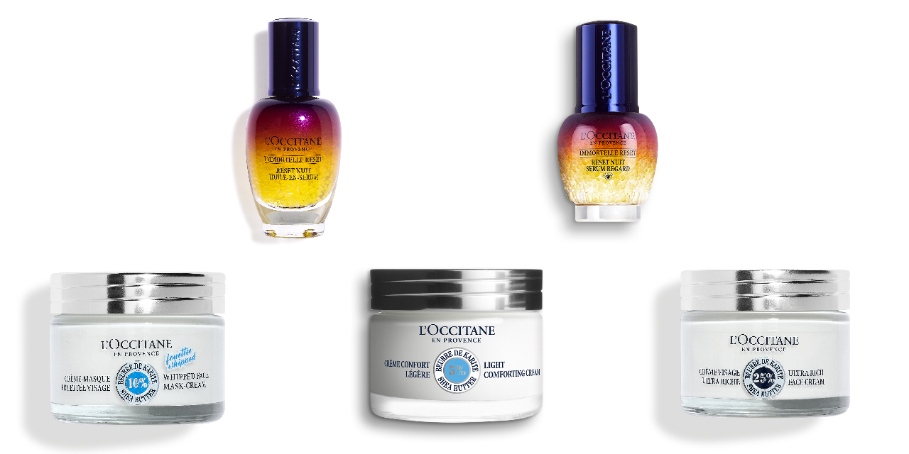 Shea yağının besinsel nitelikleri üzerine yapılan çeşitli araştırmalar, yüksek miktarda magnezyum ve potasyum içerdiği bulunduğunu göstermiştir. Shea yağındaki oleik asit ve linoleik asit birbirini dengeler. L’Occitane Shea Butter Light Comforting Cream, Shea Butter Ultra Rich Comforting ya da Shea Butter Ultra Rich Comforting Cream kullanırsanız ve gece bakımı Reset göz ve yüz serumu ile kremlerin performansını artırarak tamamlarsanız cildiniz yağlı hale gelmeden dengelenmiş olur. Adı artık cilt bakım sırlarından biri olarak anılan L’Occitane Reset serum, benzersiz çift bazlı yapısı ve ölmez otu esansiyel yağ içeren altın baloncukları, 8'den fazla patenti ile ciltteki onarım gücünü ilk anda hissettirir.