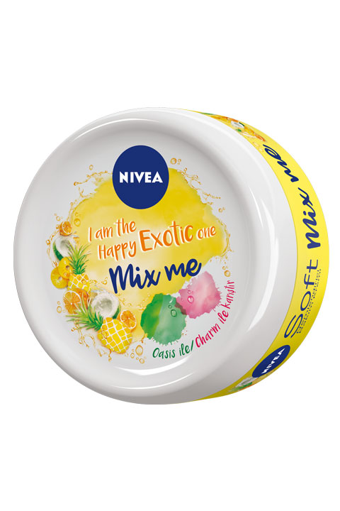 Günlük kullanıma uygun el, yüz ve vücut bakım kremi olan Mix Me I am The Exotic Happy One Nemlendirici Bakım Kremi, tropik meyvelerin keyifli ve nefis kokusunu yansıtıyor. Parfümörlerle birlikte özenle geliştirilen ve kendi başına harika kokan ürün; NIVEA SOFT, Berry ve Oasis ile direkt cilt üzerinde karıştırılarak bambaşka kokular elde edilebiliyor.