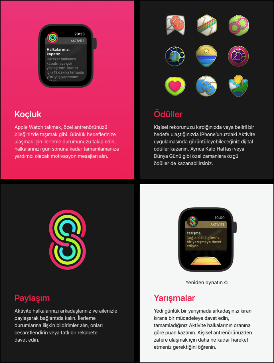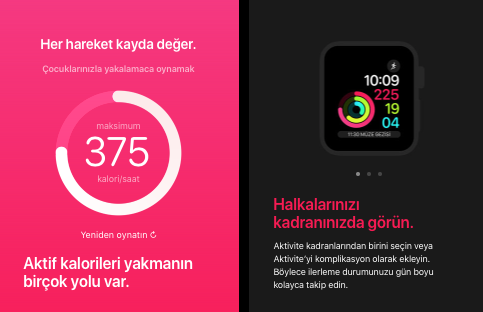 Apple Wacth’un hareket halkaları hem farkındalığınızı artırıp hem de daha sağlıklı bir gün geçirmeniz konusunda sizin en iyi takipçiniz. Aktivite halkalarını tamamlayarak daha sağlıklı bir gün geçirmek o kadar basit ve eğlenceli bir hale geliyor ki, bunu en sevdiğiniz alışkanlıklarınız içine kolaylıkla alıyorsunuz. İşte Apple Watch’taki Aktivite uygulamasının ardında bu fikir yatıyor.