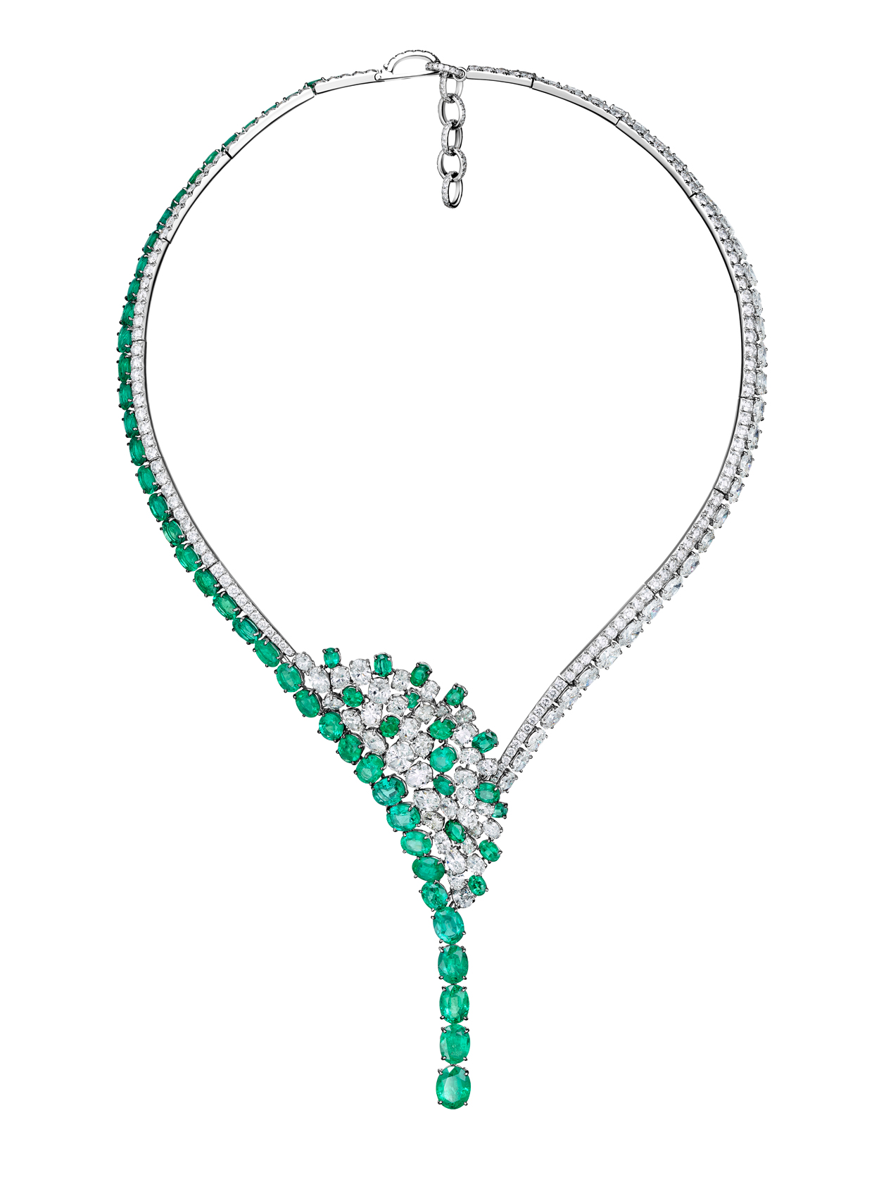 Adler’in ustaları, ormanların en güzel canlılarından birinden esinlenerek, doğanın gücünü sembolize eden bir mücevher tasarladı. Merkezinde bir papağan siluetini anımsatan formuyla pırlanta ve zümrütlerle örülü “Papagayo” adlı kolye boynun zarafetiyle bütünleşiyor. Ve istisnai renklere sahip 4 heybetli zümrüt papağanın kuyruğunun görkemini perçinliyor. “Papagayo” adlı kolye, 30.29 karat oval kesim 59 adet zümrüt, 23.04 karat 73 oval kesim pırlanta ve 18.28 karat 64 pırlantadan oluşuyor.