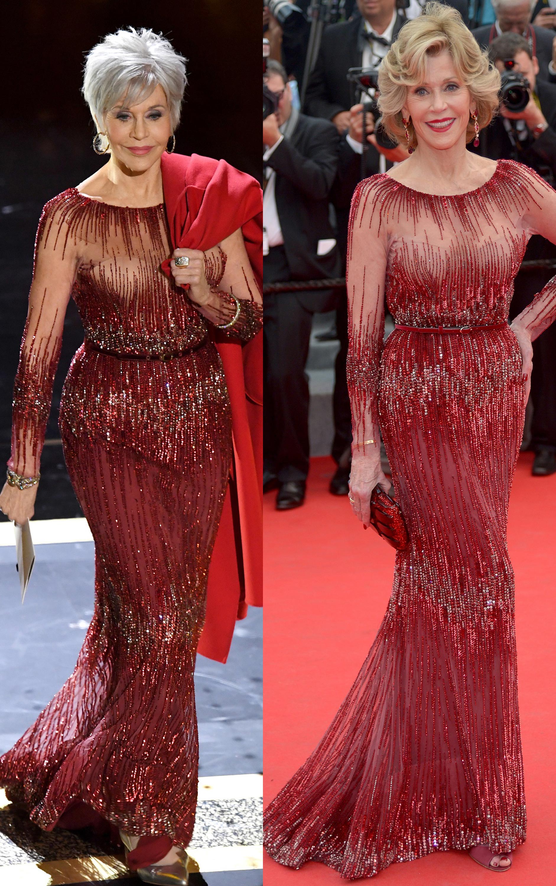 2. Jane Fonda, kırmızı göz alıcı elbisesi ile Hollywood, California'da 09 Şubat 2020'de Dolby Theatre'daki 92. Yıllık Akademi Ödülleri'nde sahnede konuşuyor.Oyuncu Fonda aynı abiye ile 14 Mayıs 2014 tarihinde Cannes, Fransa'da düzenlenen 67. Yıllık Cannes Film Festivali sırasında Açılış törenine ve "Monako Grace" Prömiyerine katılıyor.
