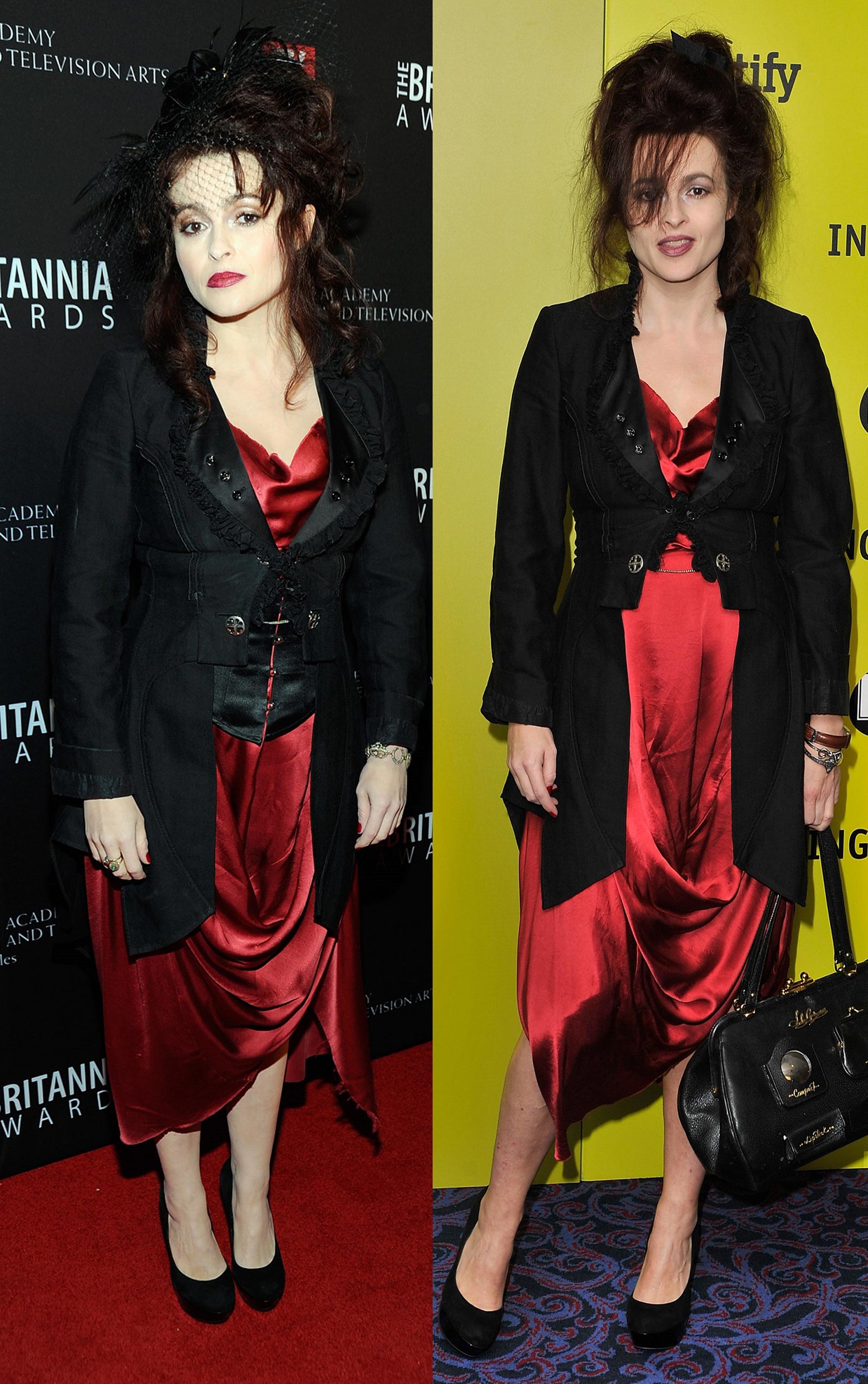 1. Helena Bonham Carter 30 Kasım 2011 tarihinde Beverly Hills, California'da Beverly Hilton Otelinde BAFTA Los Angeles 2011 Britannia Ödülleri'ne kırmızı elbisesi ile geldi. Carter, 1 Kasım 2010 tarihinde de Londra, İngiltere'deki Grosvenor House Hotel'de Müzik Endüstrisi Güven Ödülleri'nde aynı elbise ile objektiflere poz verdi.